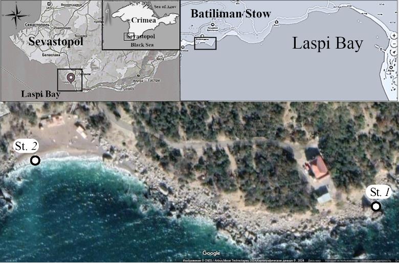 This is correlated with the reports [3] on the low number of microbial population in the loose bottom sediments of nearby Laspi Bay where the number of saprophytic heterotrophic bacteria averages 2500 cells·g–1 and the number of hydrocarbon-oxidising bacteria does not exceed 2 cells·g–1. Of the macrophytes, Cystoseira crinita (Dyby, 1830) and Ceramium diaphanum (Roth, 1806) dominate year-round in terms of occurrence, while C. crinita and C. barbata (C. Agardh, 1820) dominate in terms of phytomass [4]. Cystoseira spp. is the main component of coastal phytocenosis and one of the main sources of organic matter [5]. Besides, Cystoseira spp. is considered to be the most suitable object of algomonitoring in assessing the environmental quality of marine coastal water areas, including the water area of Batiliman Stow [6].