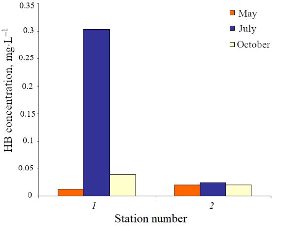 The total HC content in water at the studied stations from May to October 2023 ranged from 0.013 to 0.304 mg∙L–1 (Fig. 2). In July, at St. 1, the exceedance of MPC for fishery water bodies (0.05 mg/L) [4] by 6 times was recorded (Fig. 2), at St. 2 during the study period, the value of HC concentration was rather low and did not exceed the MPC.