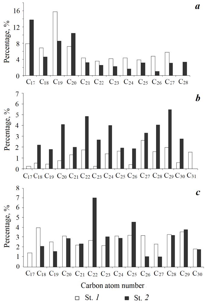 At St. 1, the n-C17 homologue was identified in small amounts, while at St. 2 it was not detected at all (Fig. 3, b). The TAR index at both stations was significantly greater than unity (Table 2), indicating the predominance of allochthonous matter coming from land.