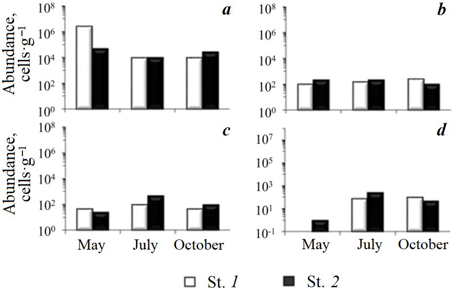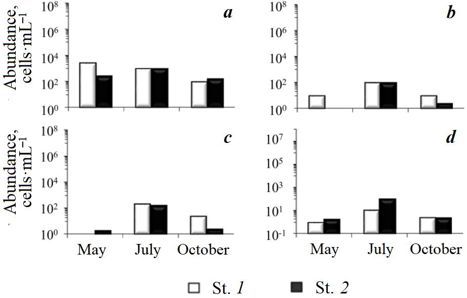 POBs at St. 1 were detected in all samples (Fig. 4, d). The maximum (10 cells×mL–1) was detected at station 1 in July, while in the other samples of St. 1, this group of bacteria was represented by single cells per millilitre of seawater. At St. 2, POBs were also detected in all samples (Fig. 4, d). The maximum (95 cells×mL–1) was detected at St. 2 in July. In other samples, the POB abundance was under 10 cells×mL–1.