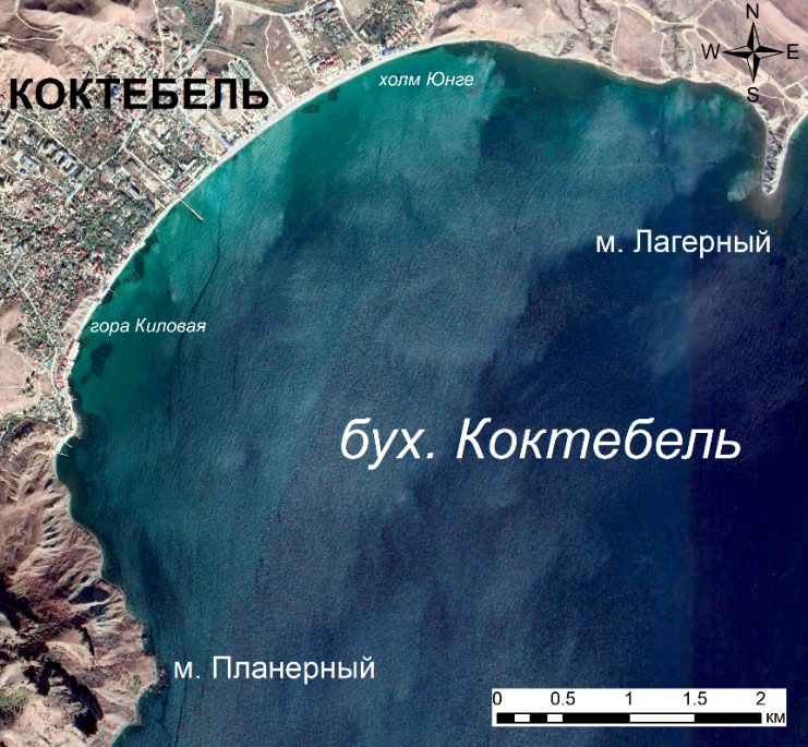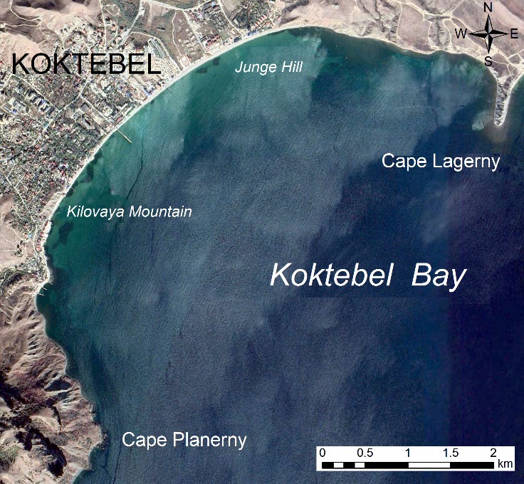 Koktebel Bay (here and below the official names of geographical objects are given) is located between Cape Planerny (formerly called Malchin) in the west and Cape Lagerny (formerly called Toprakh-Kaya) in the east (Fig. 1). The resort village (urban-type settlement) of Koktebel is located on the shore of the bay. The length of the bay coastline is about 7 km. The distance along the line connecting the above mentioned capes is about 4 km, with the largest perpendicular to this line being 2 km long. Thus, the bay forms an almost perfect semicircle.