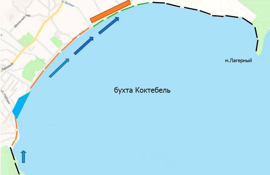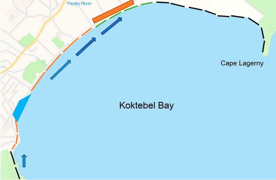 Therefore, when developing a new project for the reconstruction of the embankment and restoration of the beaches of Koktebel Bay with a total length of 1850 m, these provisions were taken into account. Thus, the original project provided for the construction of a system of groins. As a result of numerous discussions, including ones with the participation of employees of MHI, this project was rejected and another version was adopted. It provides for the construction of one groin 70 m long and backfilling of the beach with a width of 35 to 45 m. The groin located in the western part of the bay should limit the movement of beach material in the western direction and at the same time should not distort the natural landscape of Koktebel Bay significantly. Taking into account the movement of beach material, the criterion for assessing the need to replenish the beach area will be the width of the beach in the groin area. The beach material recommended by the project is gravel with a fraction of no more than 40 mm. Reconstruction of the embankment began in 2023 and is expected to be completed at the end of 2024.