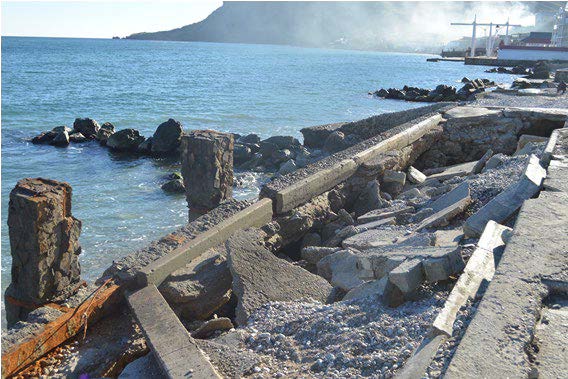 In 2005, in the area northeast of the rescue station, where there was an artificial pebble beach and a prefabricated stepped slope structure made of flight slabs, part of the stepped slope structure was dismantled without permission and a vertical wall was erected. Here, part of the embankment was expanded by means of a stepped slope structure – a vertical reinforced concrete wall was erected along the abutment of the flight slabs, the sinus was filled with soil, a concrete covering was installed and later concrete tiles were laid on top of the concrete. The vertical wall installed instead of the existing slope structure contributed to the degradation of the beach, which subsequently led to its erosion and destruction. In the central part, to the west of the Voloshin House Museum, two platforms protruding into the sea were built illegally. Such transverse structures represent an obstacle to the existing flow of sediments and cause the accumulation of beach material in front of the structure and erosion behind the structure (in the direction of the flow). By 2009, this process had already been quite pronounced. Since the sediment flow is directed toward the center of the bay, the width of the above-water part of the beach northeast of the above mentioned platforms (in the area of the Voloshin House Museum) has decreased by 6–8 m in two years since the start of construction of the sites (2006); at the same time, beach material accumulated to the southwest. The structures built in the waterfront zone and extended into the sea prevented the natural movement of material and they were subjected to the intense wave action, as a result of which some of them were destroyed (Fig. 7).