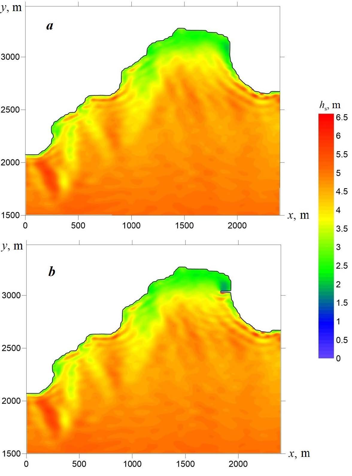 Fig. 3. Significant wave heights in Laspi Bay for storms possible once every 25 years: without taking into account the hydraulic structure (a); taking into account the hydraulic structure (b)