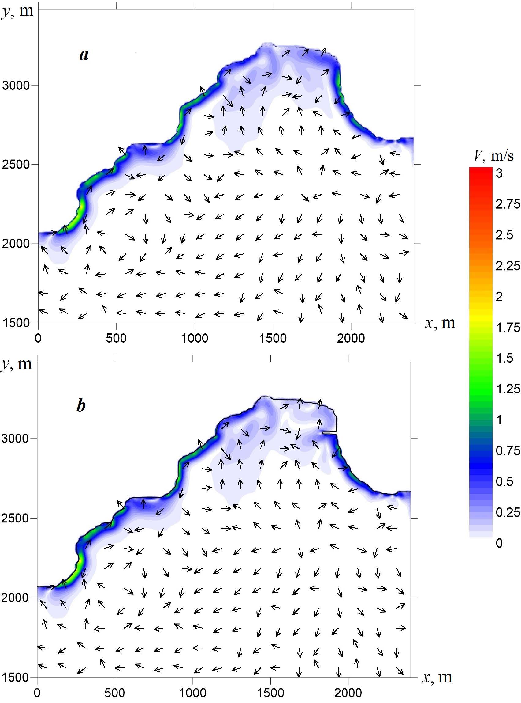 Fig. 4. Wave currents in Laspi Bay for storms possible once a year: without taking into account the hydraulic structures (a); taking into account the hydraulic structure (b)