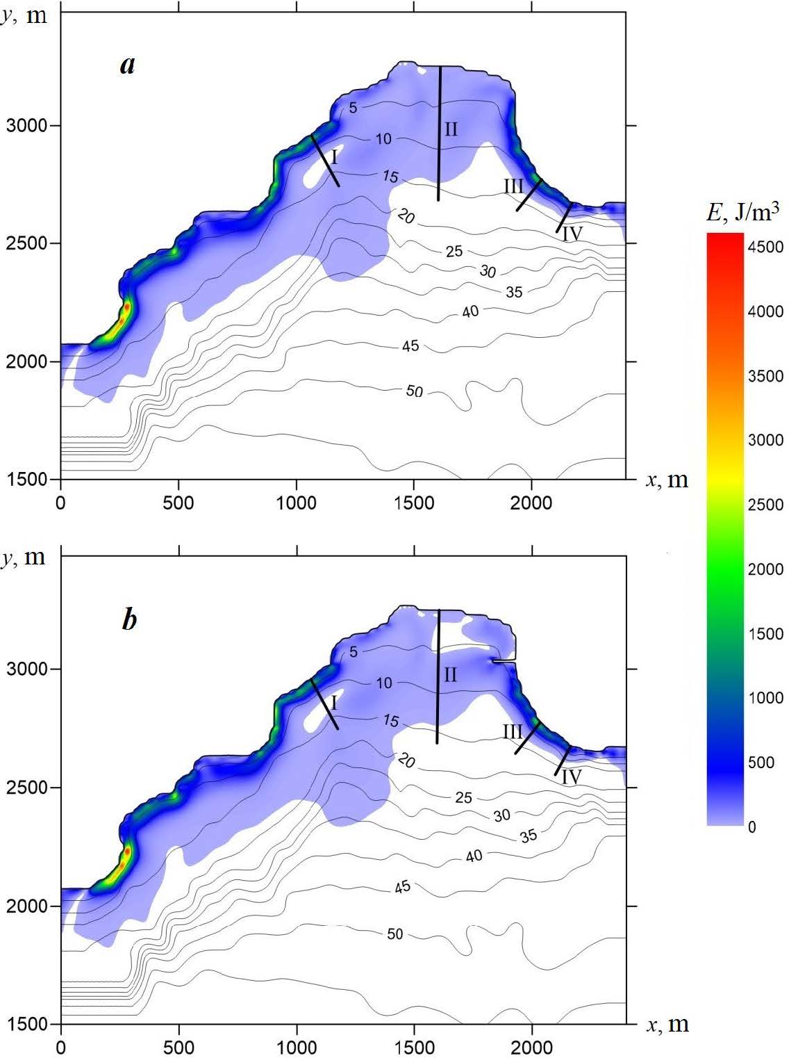 Fig. 6. Distribution of kinetic energy density in Laspi Bay for a storm possible once every 25 years: without taking into account the hydraulic structures (a); taking into account the hydraulic structure (b). Numbers I–IV indicate section numbers [2]