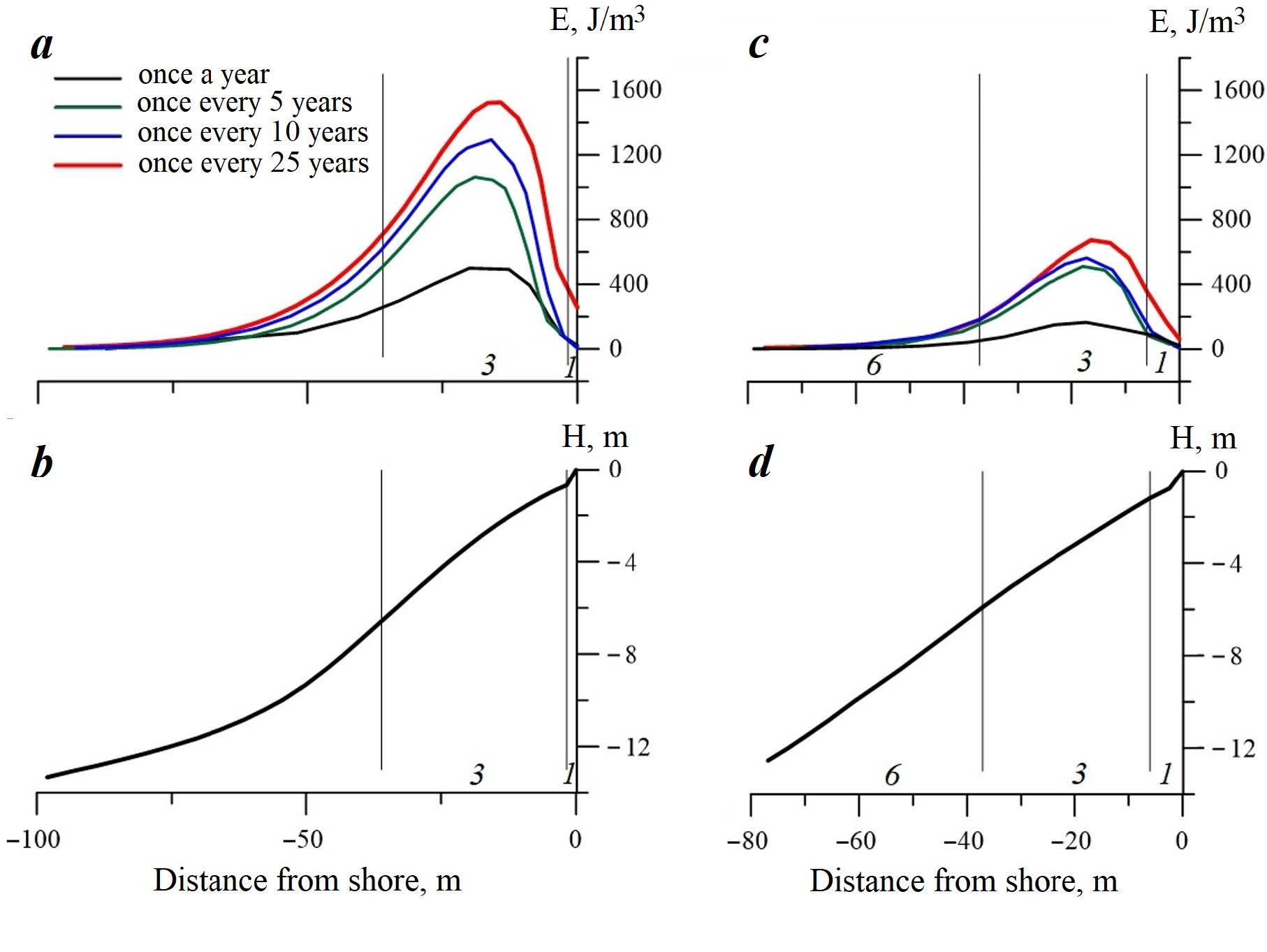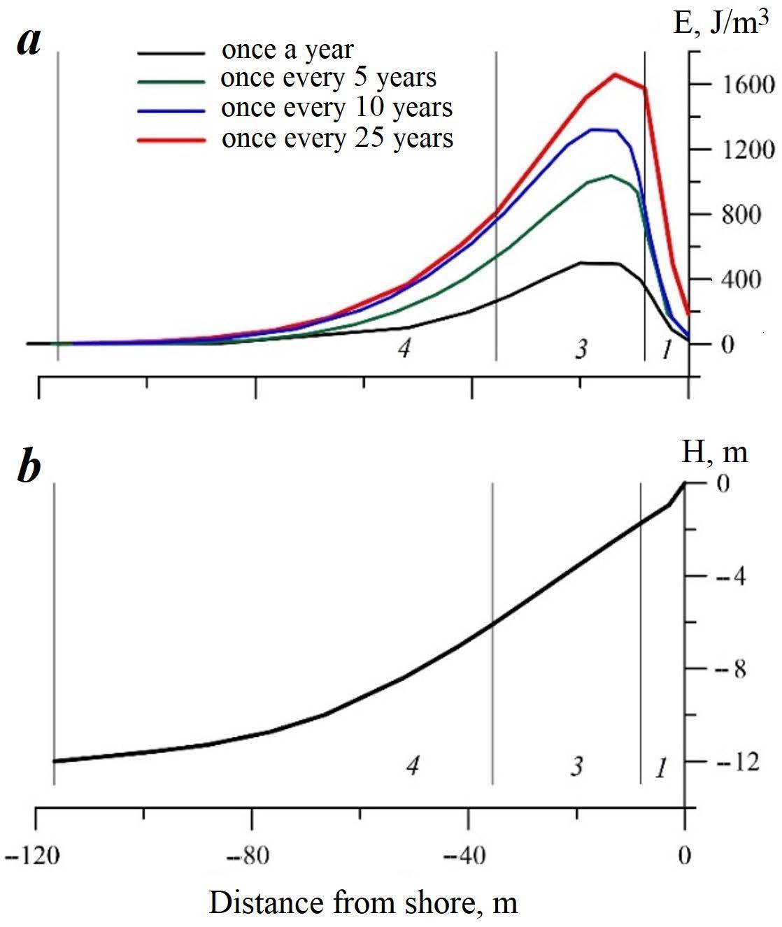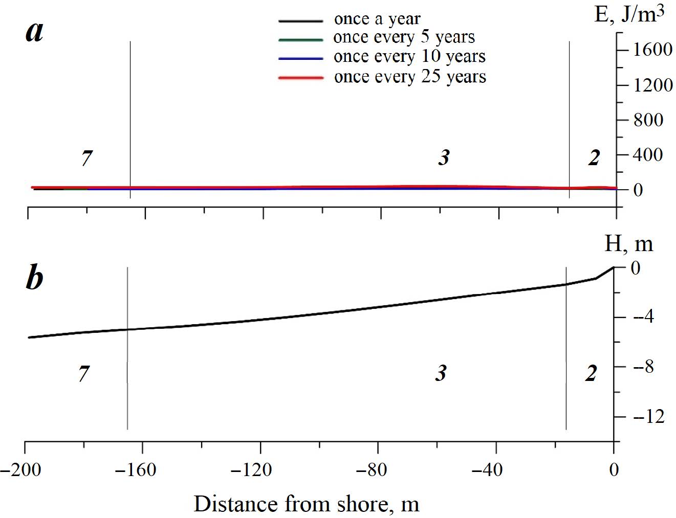 For sections III and IV (the eastern part of the bay) (Fig. 9), the energy load is insignificant near the shore, then it increases to its maximum at depths of 2–6 m, where also a fairly steep underwater slope with a predominance of Cystoseira is located (number 3 in Fig. 9). For section III, in case of storms possible once a year, the maximum energy load is about 500 J/m3; during storms possible once every 5, 10, 25 years, it reaches 1100, 1300, 1600 J/m3, respectively. For section IV, the wave load decreases significantly, with 150 J/m3 once a year and 500, 550, 700 J/m3 once every 5, 10, 25 years, respectively.