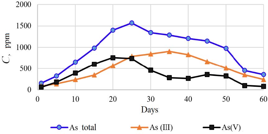 Changes in the concentrations of arsenic and some major heavy metals in arsenopyrite ore accumulated in the aqueous phase during 60 days are shown in Fig. 4.