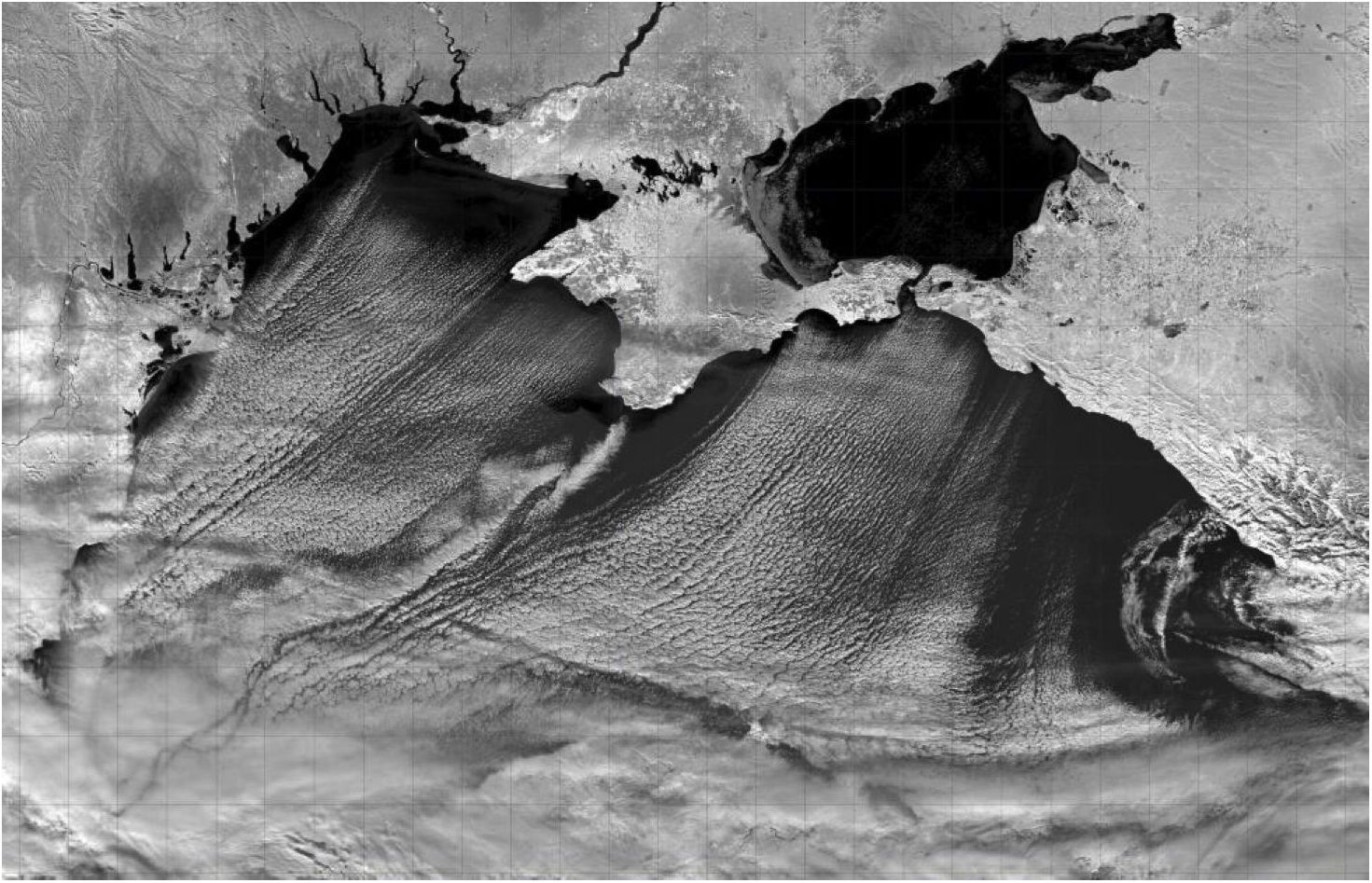 Обычно случаи вторжения масс холодного воздуха соответствуют прохождению через северную границу моря холодного атмосферного фронта. Они сопровождаются повышением скорости приземного ветра до 10–15 м/с и понижением температуры воздуха до –5...–10 °С. В результате в холодном пограничном слое атмосферы над относительно теплым морем, температура которого в зимний период находится в пределах 5–9 °С, развивается интенсивная конвекция и облачность. Характерная картина облачности наблюдается на космических снимках в виде ячеистых или валиковых структур [2]. Пример такого снимка приведен на рис. 1.