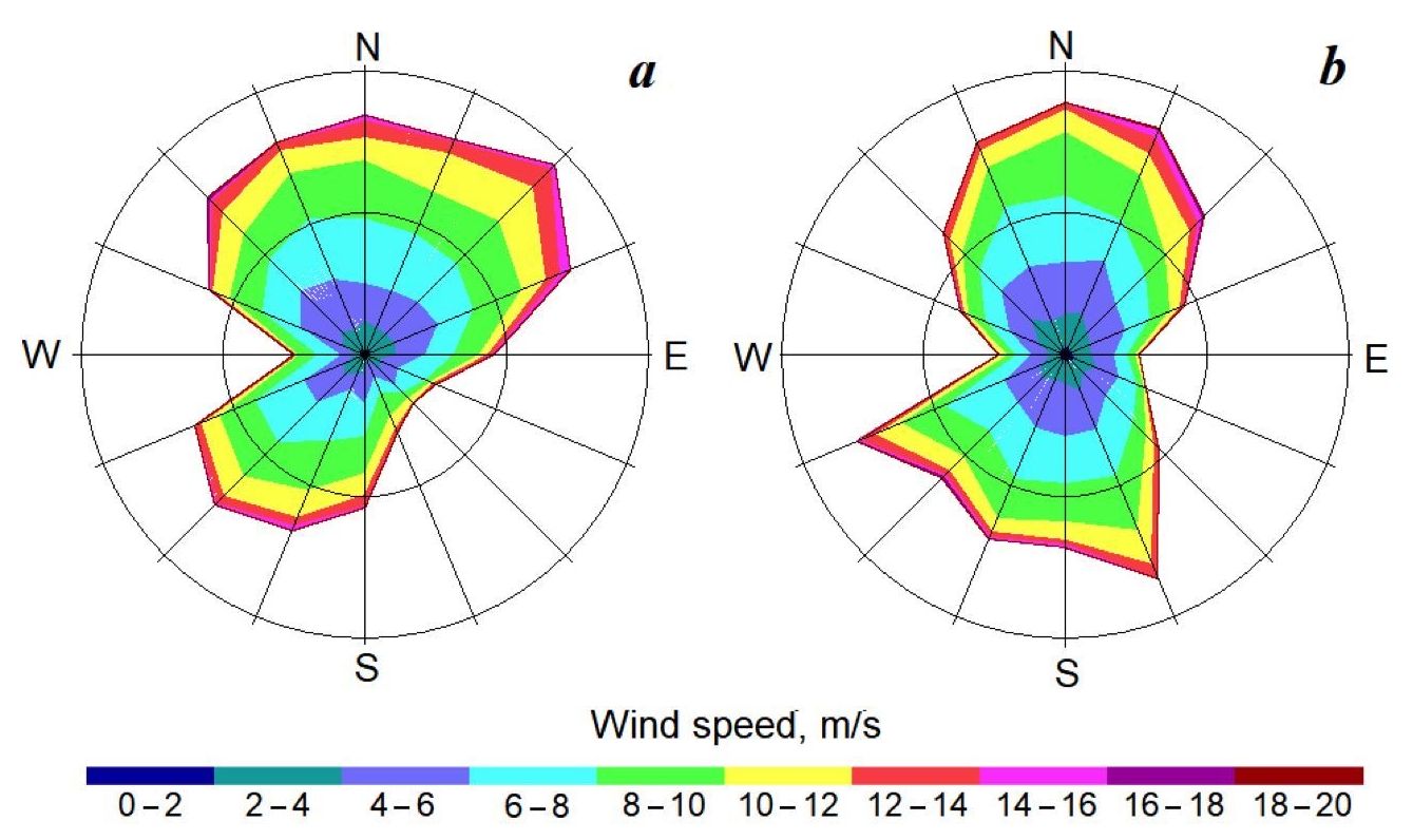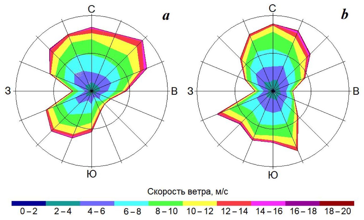 Рис. 2. Розы ветров в морских точках на западе (а) и востоке (b)