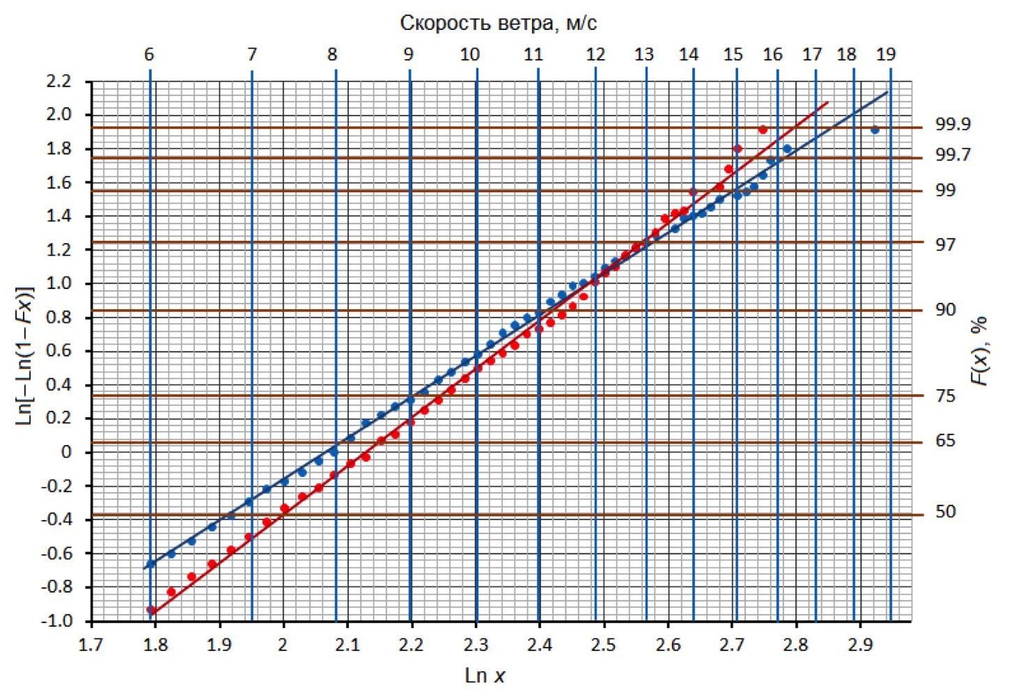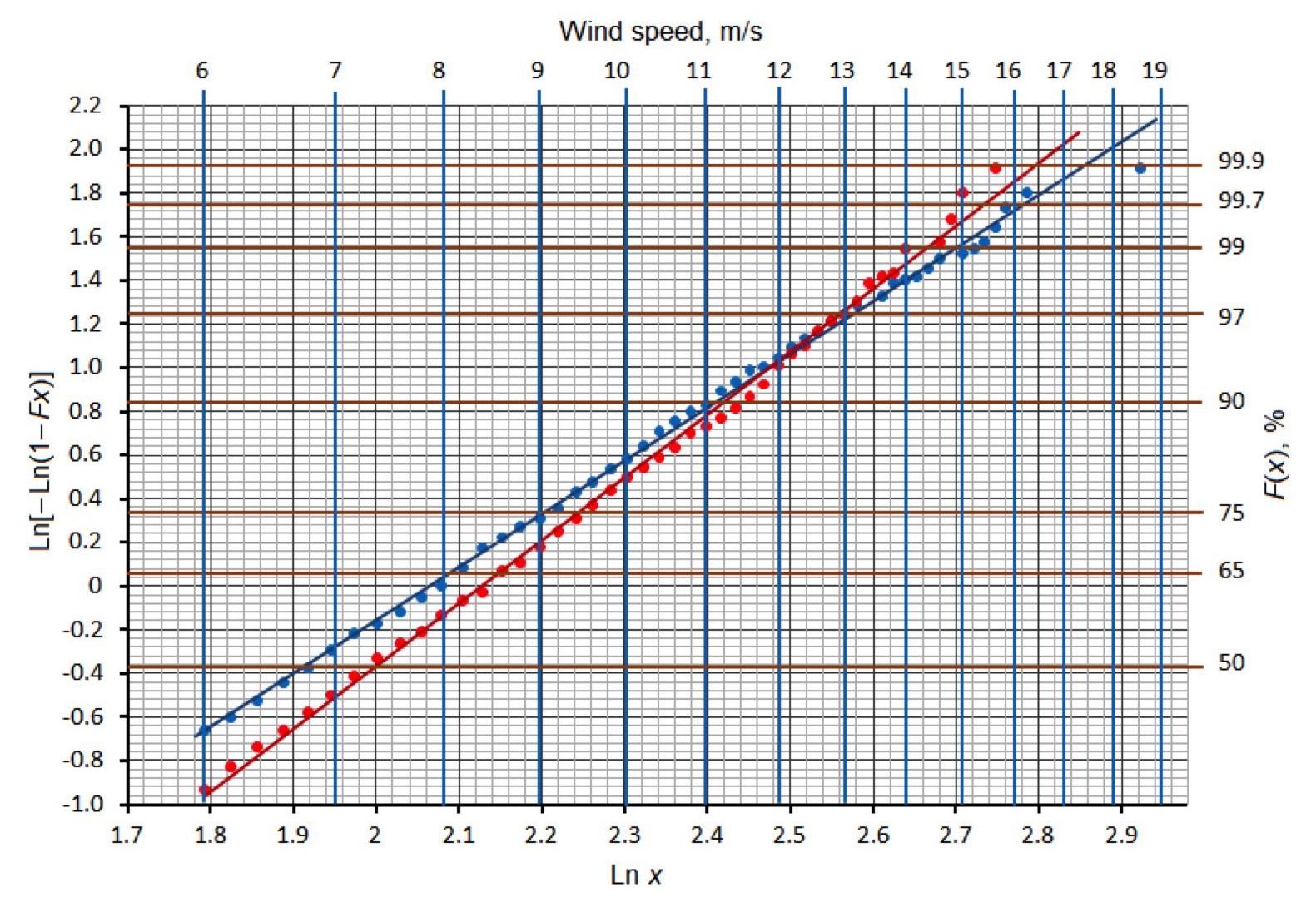 Fig. 3. Cumulative distribution functions of wind speed values in logarithmic coordinates at offshore points in the north-west and north-east of the Black Sea (the blue dots are 44° N, 37° E; the red dots are 45.5° N, 31.5° E)