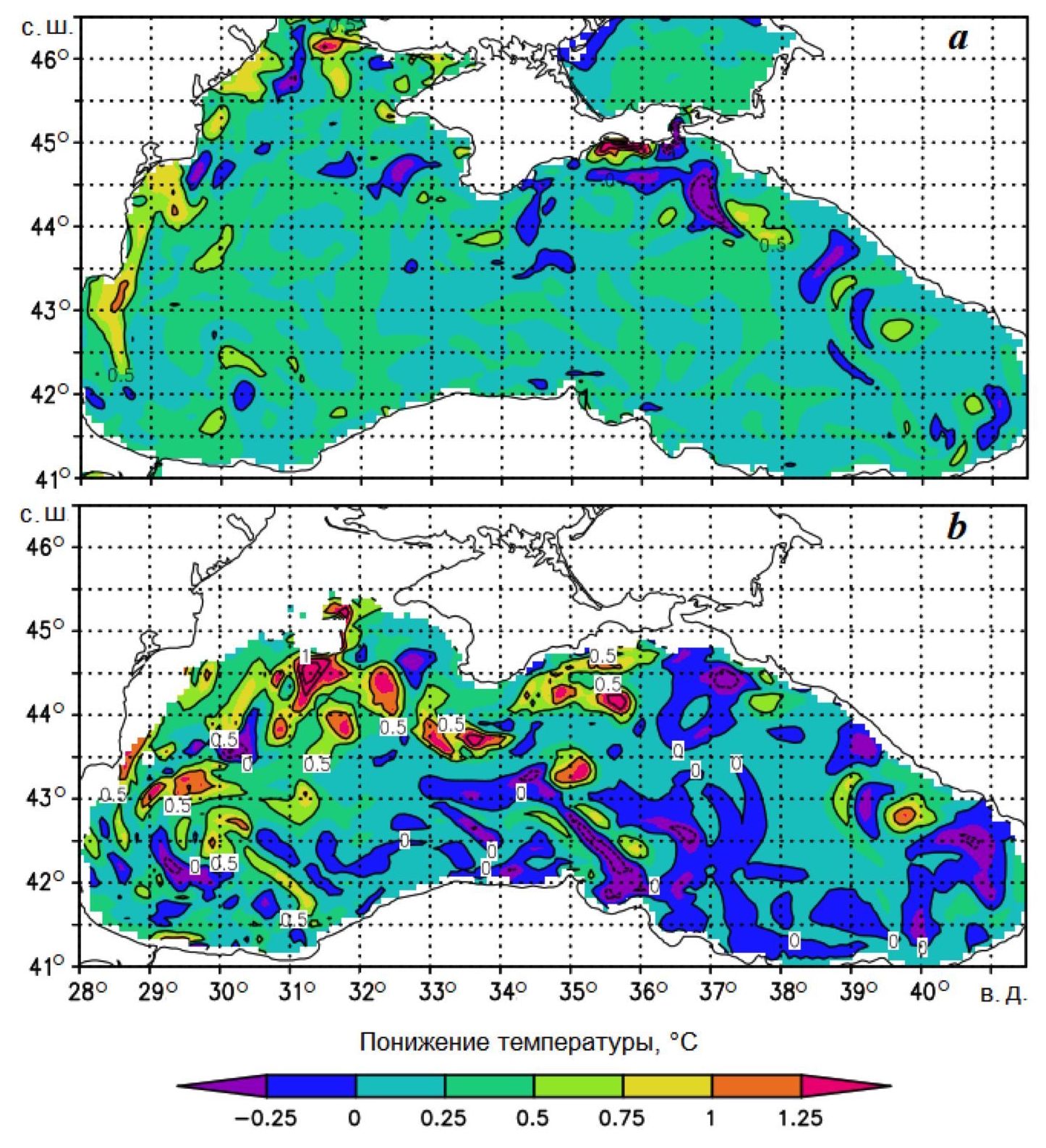 Как видно из рис. 4, понижение температуры распространилось в верхнем слое вплоть до глубины 50 м. При этом распределение понижения поверхностной температуры моря пространственно значительно более однородно по сравнению с полем понижения температуры на глубине 50 м. Вообще говоря, физический механизм глубокого проникающего охлаждения в зимний период, проявляющегося в неоднородностях поля температуры, требует отдельного рассмотрения.