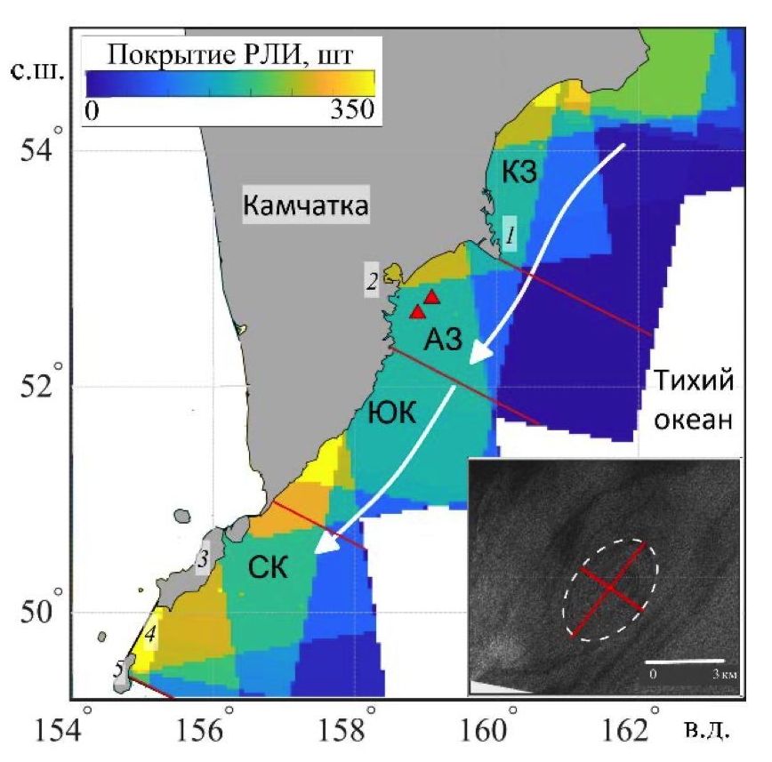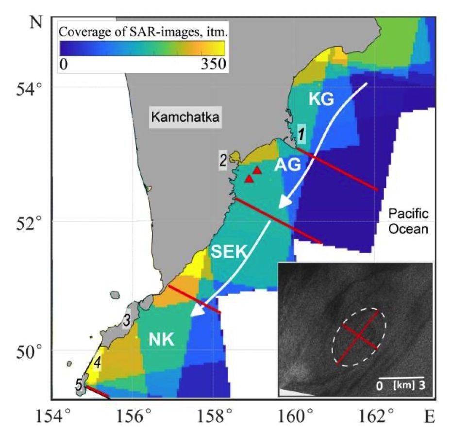 Fig. 1. Coverage of SAR-images between March and August for 2015–2021: КЗ – Kronotsky Bay; AЗ – Avacha Gulf; ЮК – South-eastern Kamchatka; СК – Northern Kuril Is-lands. 1 – Cape Shipunsky, 2 – Avacha Bay, 3 – Paramushir Island, 4 – Fourth Kurl Strait, 5 – Onekotan Island. The triangles indicate the Northern and Southern deep-water canyons in the Avacha Gulf. The white arrows show the main flow of the East Kamchatka Current. The inset shows an example of the manifesta-tion of a cyclonic eddy structure on a SAR-image on 16 July 2016 at 19:57 UTC+0. The dashed line denotes the eddy boundary, the red lines are its large and small diameters