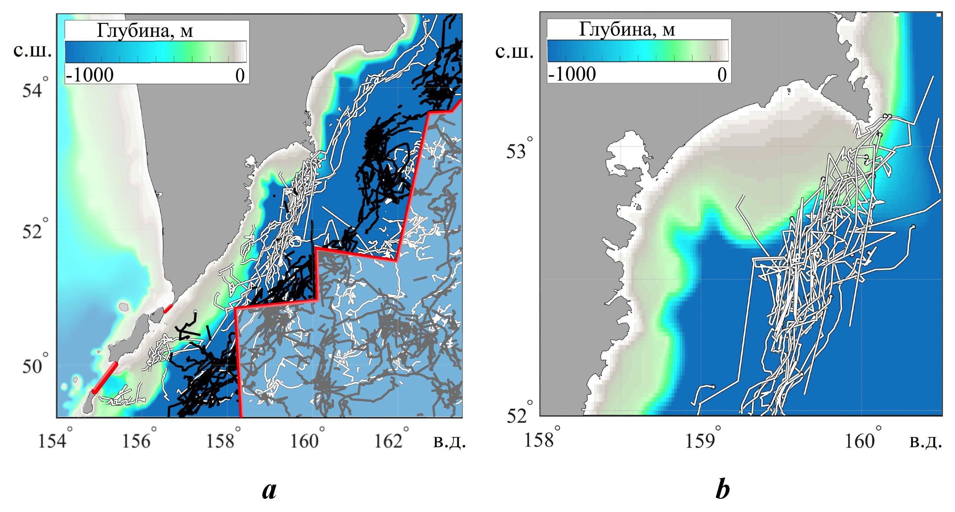 Рис. 2. Траектории движения мезомасштабных вихрей в районах, прилегающих к полуострову Камчатка и Курильским островам, за март – август 2015–2021 гг. (a) (черные линии – траектории движения циклонических структур, белые – антициклонических; красная ломаная линия ограничивает прибрежный район, соответствующий зоне удовлетворительного покрытия акватории РЛИ); треки анти-циклонических мезомасштабных вихрей вблизи Авачинского залива (b)