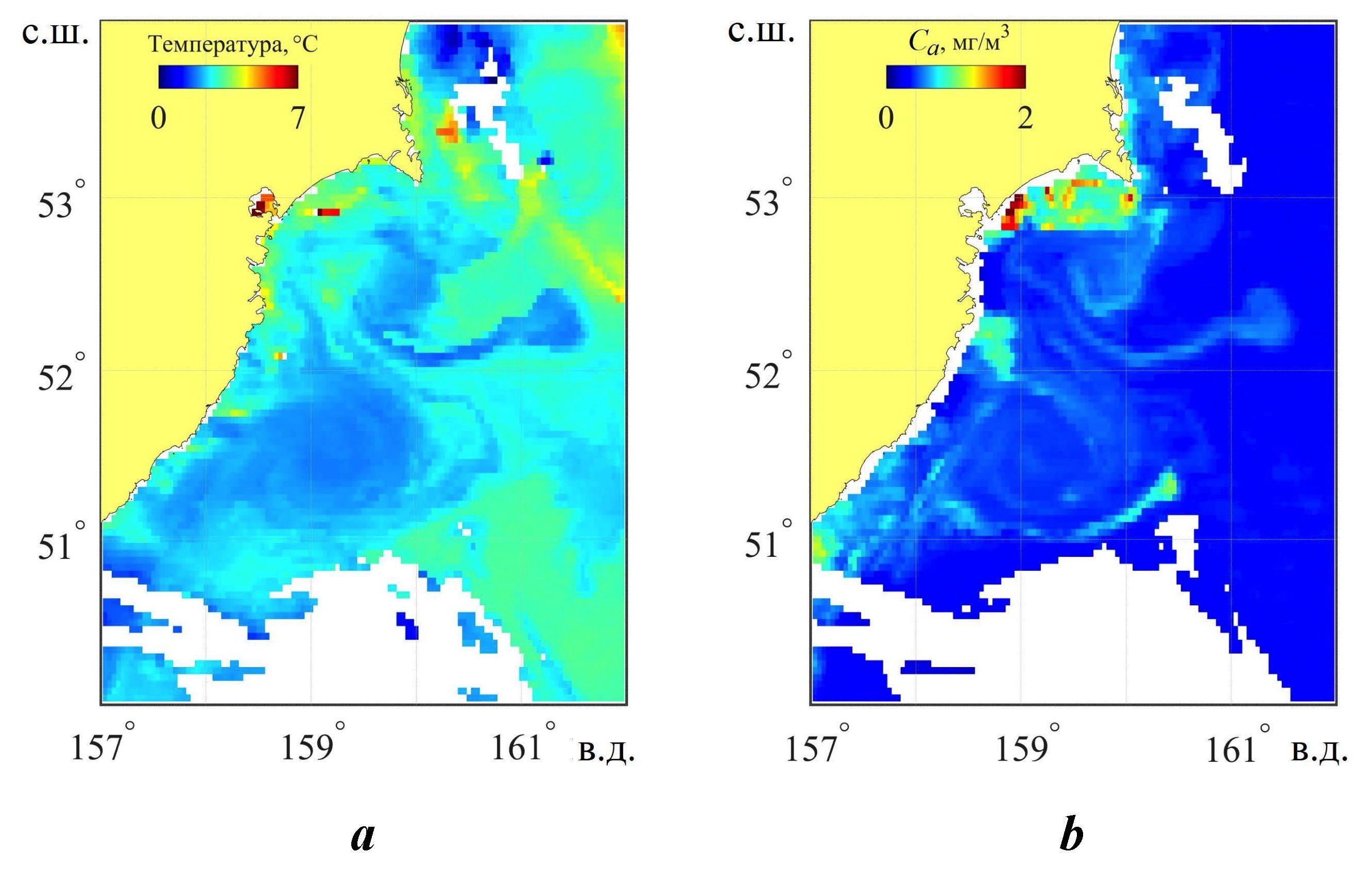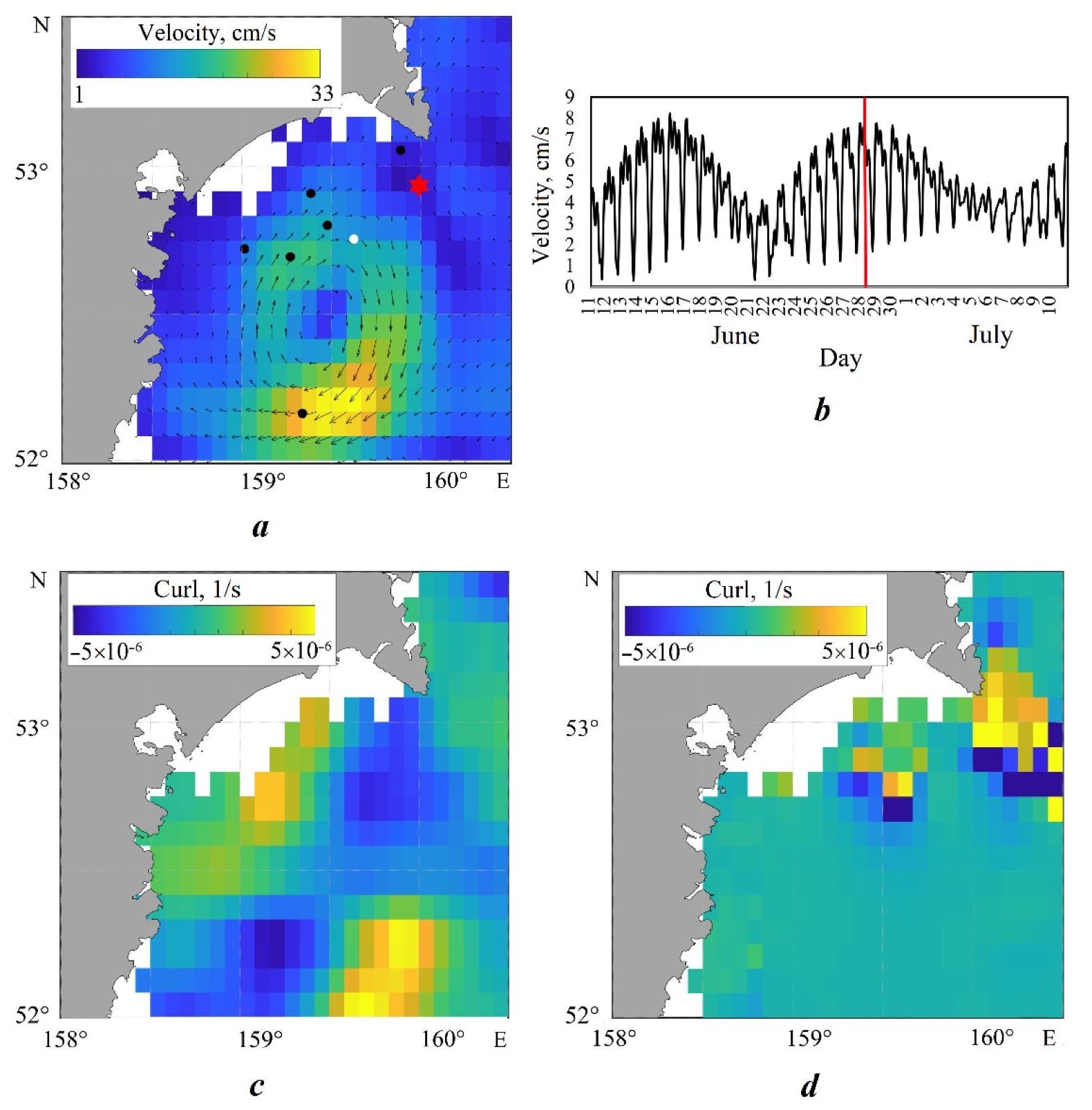 Мезомасштабные вихри. На акватории Тихого океана, прилегающей к полуострову Камчатка и северным Курилам, с марта по август 2015-2021 гг. было зарегистрировано 351 проявление мезомасштабных вихрей со средним диаметром 90 км. Среди структур отмечалось преобладание антициклонических вихрей (211) над циклоническими (140), при этом диаметры циклонов были в среднем больше, чем у антициклонов.