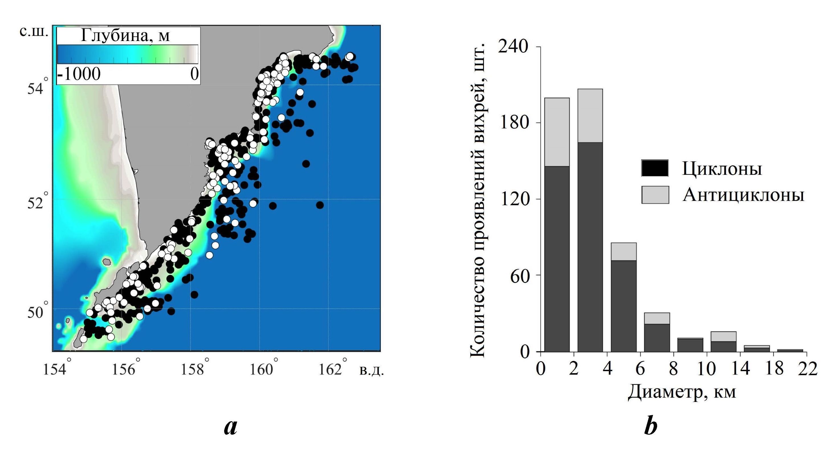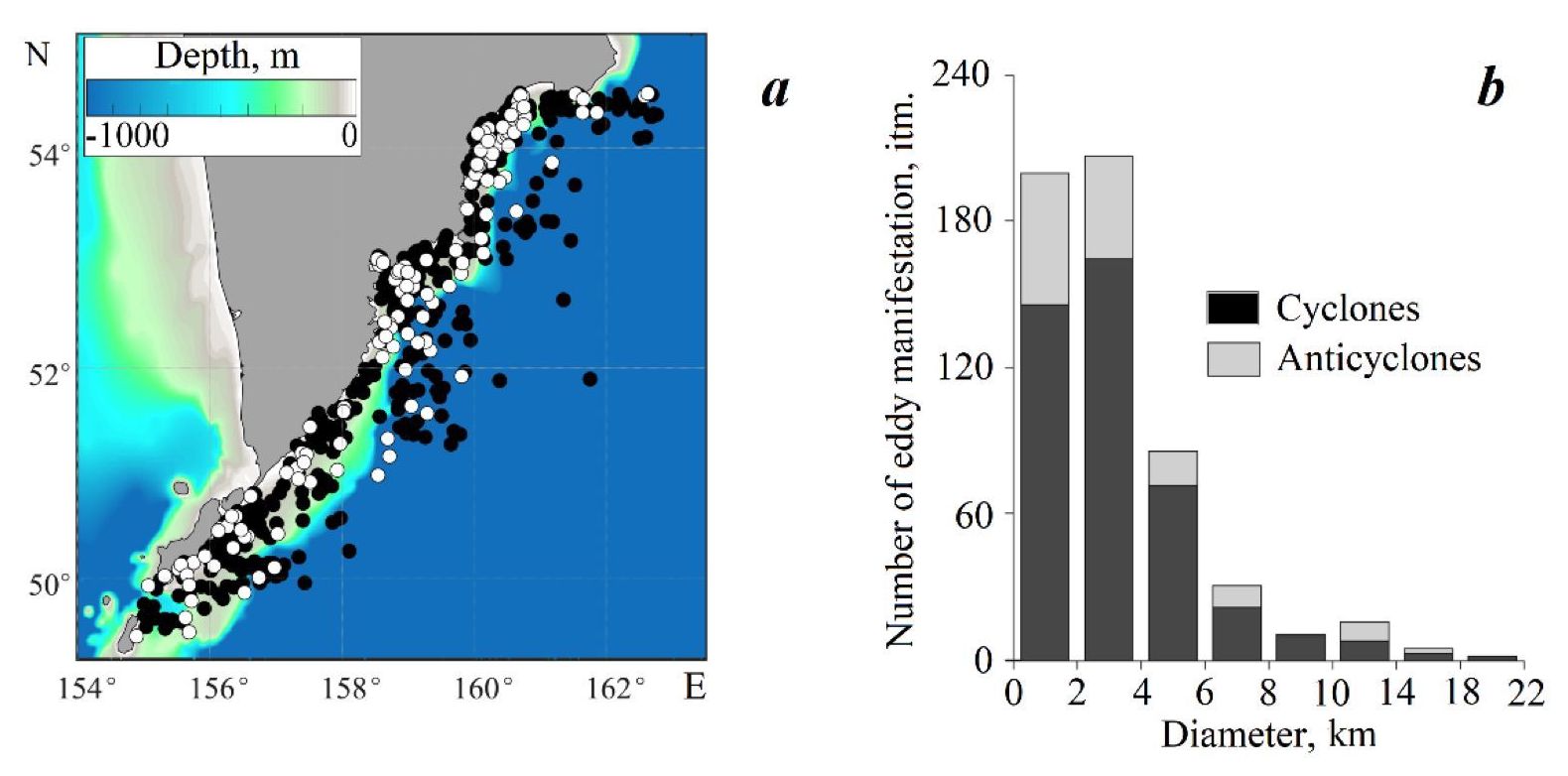 Субмезомасштабные вихри. В исследуемом районе за теплый период с 2015 по 2021 г. было зарегистрировано 559 поверхностных проявлений малых (субмезомасштабных) вихревых структур с диаметром от 300 м до 22.5 км при среднем значении 3.4 км. В целом вихревые структуры распространены по всему району (рис. 5, а), но концентрируются преимущественно в зоне шельфа и его прибрежной части. Наиболее частые проявления наблюдаются у берегов Кроноцкого залива и вблизи Авачинской бухты (чаще, чем на каждом пятом – шестом РЛИ), а также к юго-востоку от о. Парамушир (чаще, чем на каждом девятом – десятом РЛИ). Отмечается преобладание вихрей циклонического типа (428) над вихрями антициклонического типа (131). Средний диаметр у вихрей обоих типов был почти одинаковый - 3.6 км у циклонов и 3.4 км у антициклонов.