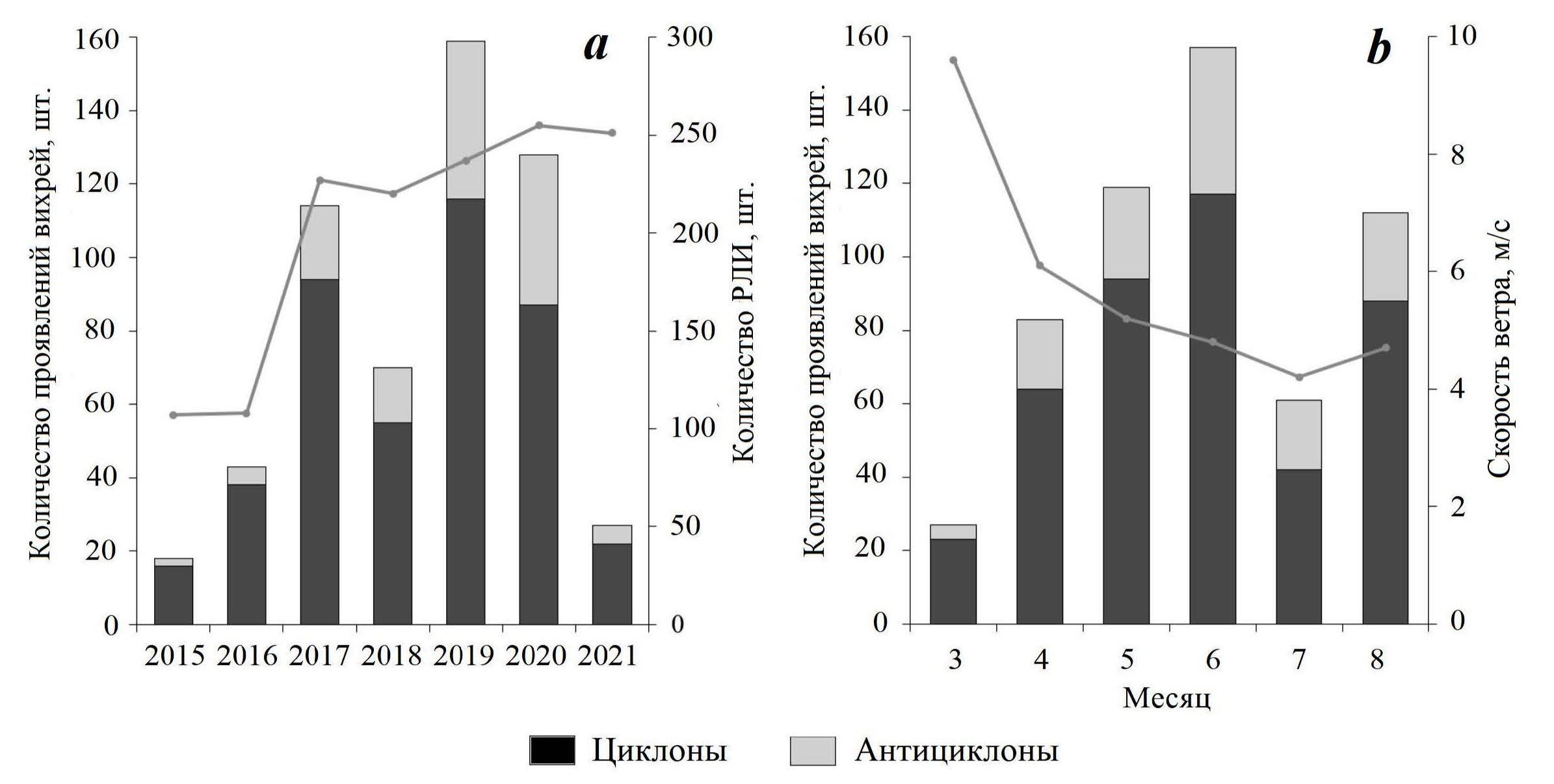 Рис. 6. Распределение количества зарегистрированных проявлений субмезомасштабных вихрей (столбики) и числа РЛИ (серая линия) по годам (а); внутригодовая изменчивость количества вихрей (столбики) и среднемесячной скорости приводного ветра (серая линяя) (b)