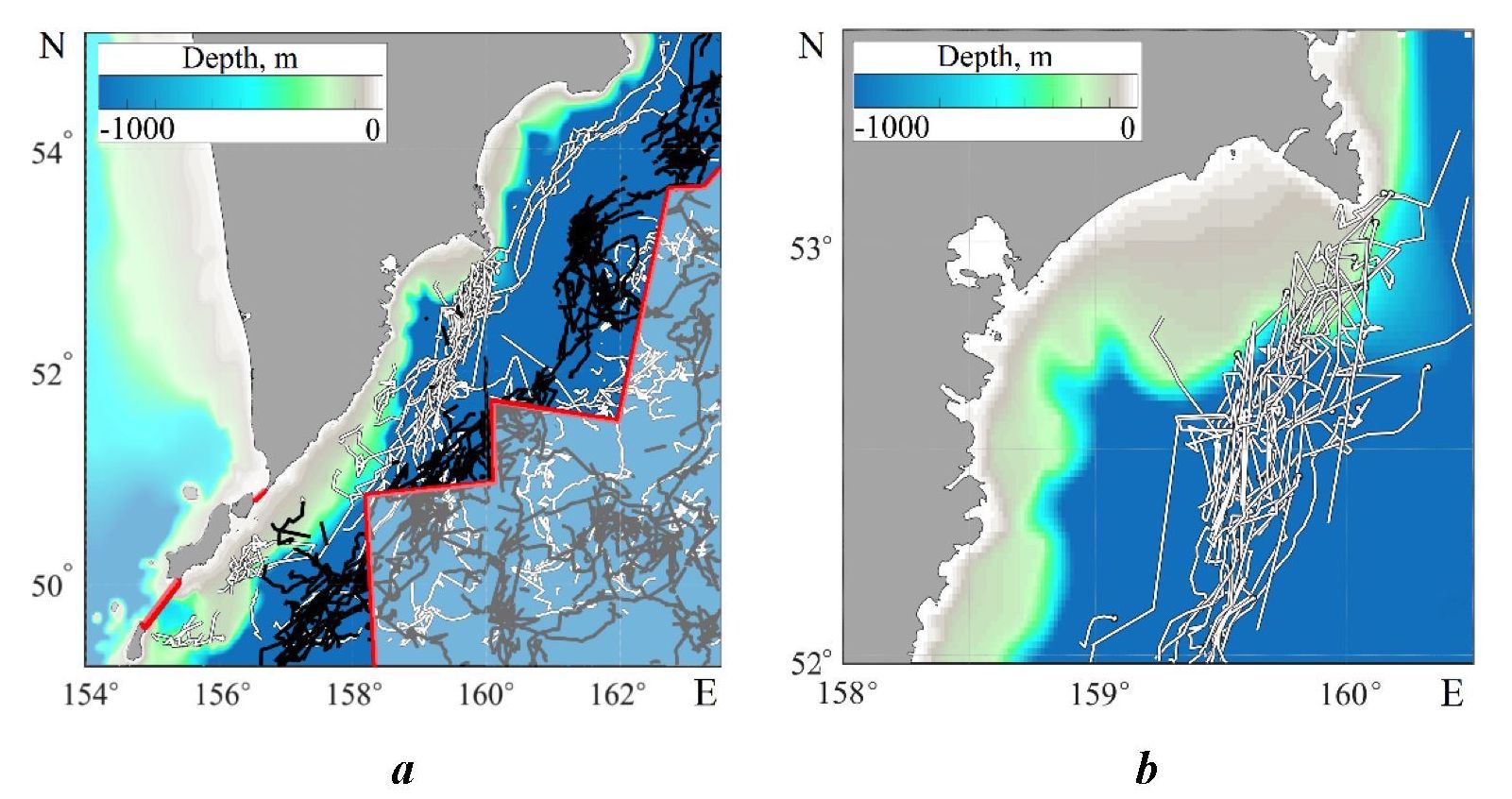 Fig. 2. Trajectories of mesoscale eddy movement in the areas adjacent to the Kamchatka Peninsula and the Kuril Islands from March to August 2015–2021 (a): the black lines indicate the cyclonic structure trajectories; the white lines indicate the anticyclonic structure trajectories. The red broken line limits the coastal area corresponding to the zone of satisfactory coverage of SAR images; tracks of anticyclonic mesoscale eddies near the Avacha Gulf (b)