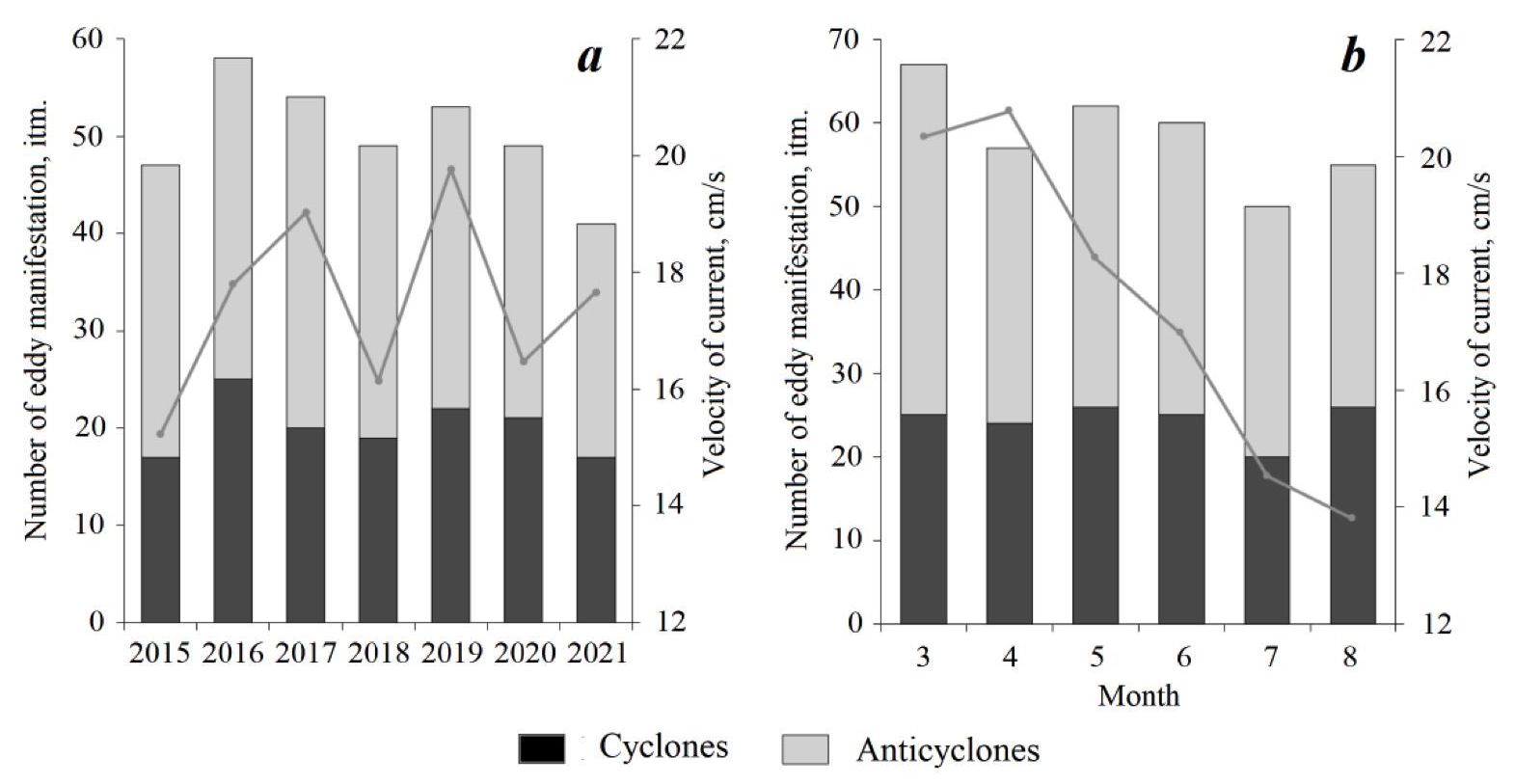 Рис. 3. Распределение количества мезомасштабных вихрей (столбики) и средняя скорость течений (серая линия) в верхнем слое, согласно данным реанализа CMEMS, по годам (a) и месяцам (b)