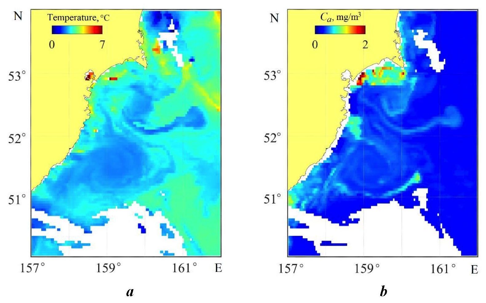 По данным о ТПО, в этот период температура ядра антициклона составляет 7.8 °С, в то время как на внешней границе поверхностная температура достигает почти 9 °С. Таким образом, большая часть малых вихрей регистрируется в области высокоградиентной термической зоны. Считается, что субмезомасштабные вихри способствуют более интенсивному вертикальному перемешиванию и адвекции, а это, в свою очередь, может влиять на особенности поверхностного распределения концентрации хлорофилла а в этой части Авачинского залива, что благоприятно для развития биоты. Такая особенность может наблюдаться даже в весенний период аналогично тому, как было представлено на рис. 4.