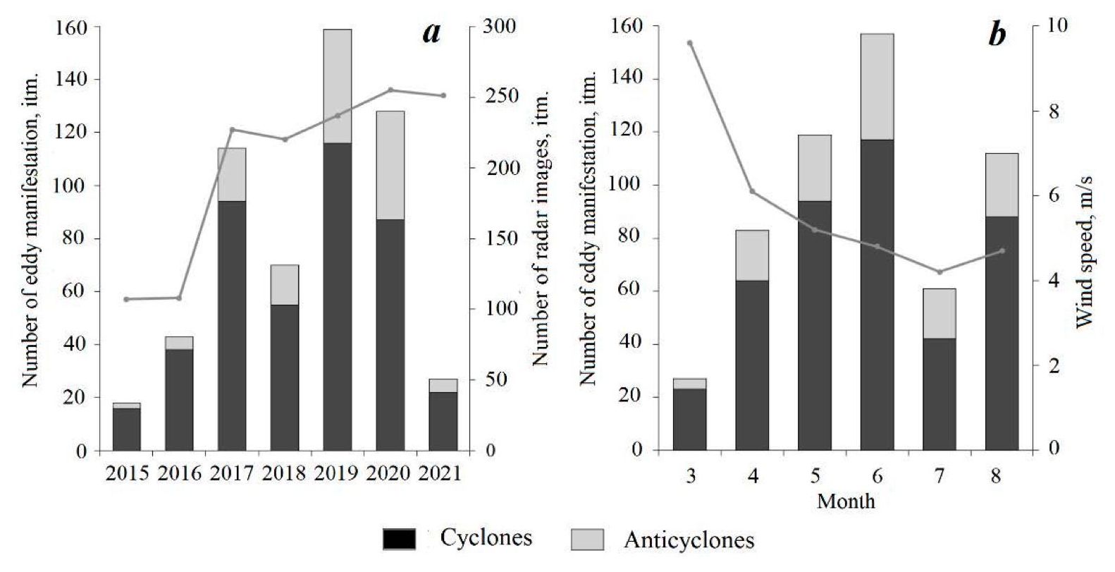 Fig. 6. Distribution of the number of registered manifestations of submesoscale eddies (bars) and the number of radar images (gray line) by year (a); intra-annual variability of the number of eddies (bars) and the average monthly speed of the surface wind (gray line) (b)