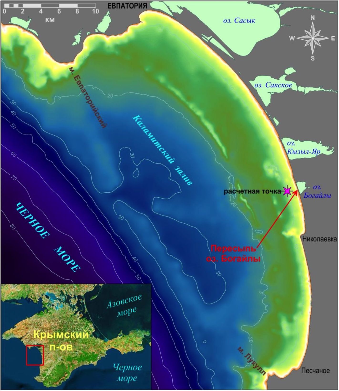 Fig. 1. Map-chart of the Kalamitsky Gulf in the Black Sea (data on underwater topography are given using SonarChart™ materials (https://webapp.navionics.com)). The calculation point is the point for which the main wave parameters were calculated