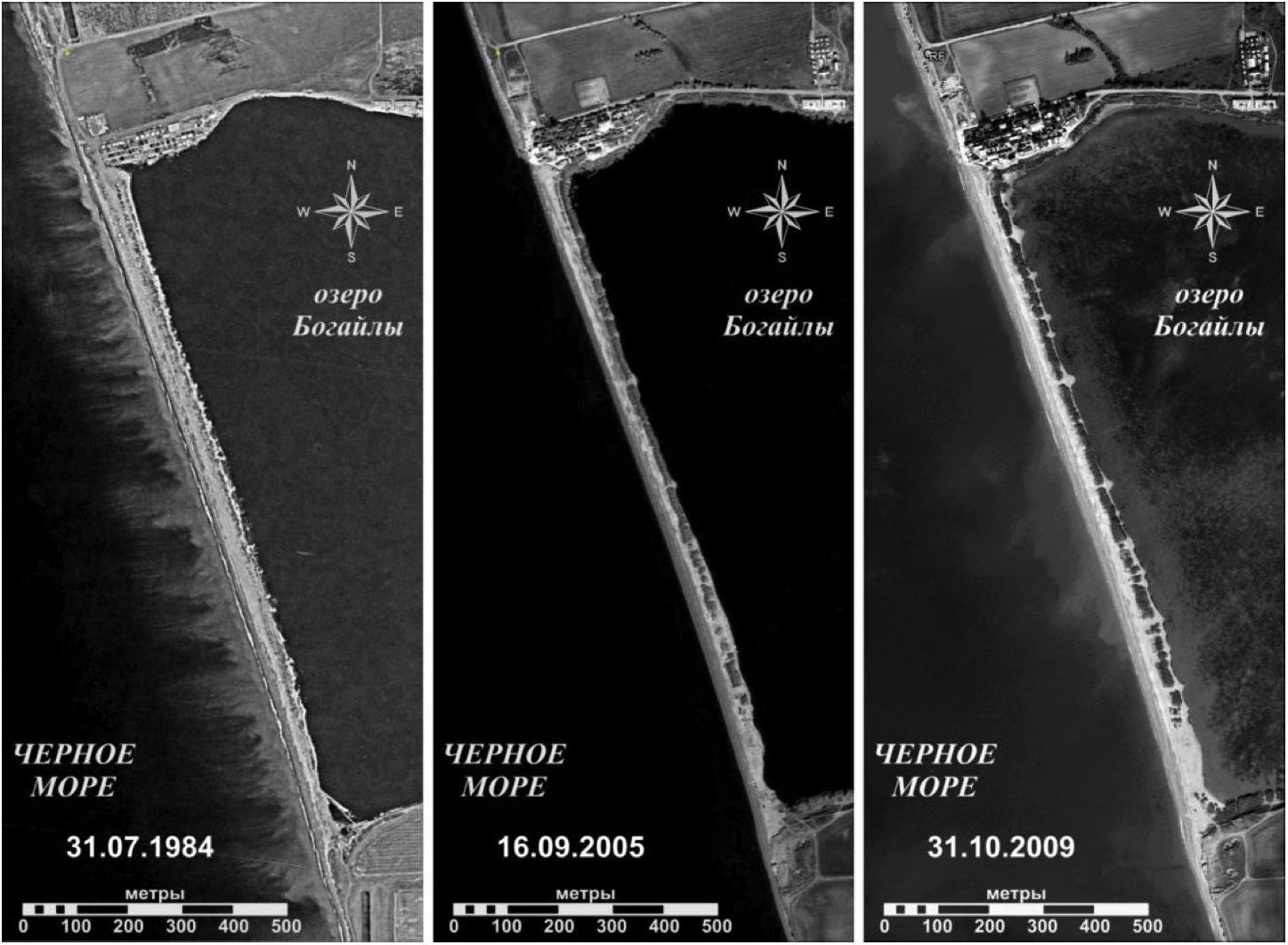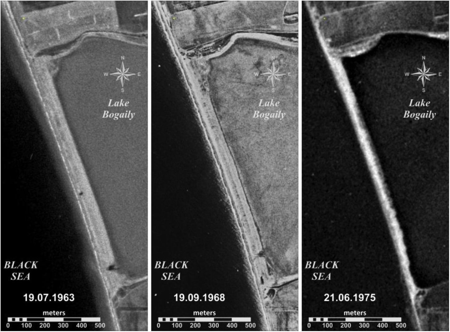 The analysis of space images allows us to state with a high degree of confidence that the structure of the over-water body of the barrier beach was completely different to what it became later, at least between the years 1963 and 1968. The images of 19 July 1963 and 19 September 1968 (Fig. 2) demonstrate that the shorelines on the sea and lake sides are straight and almost parallel, and that the barrier beach, with an average width of 80 m, exhibits minimal transverse hydrogenic forms, with the exception of a large scour in the southern part. The longitudinal zones are evident in the structure of the coastal embankments and vegetation along the barrier beach.