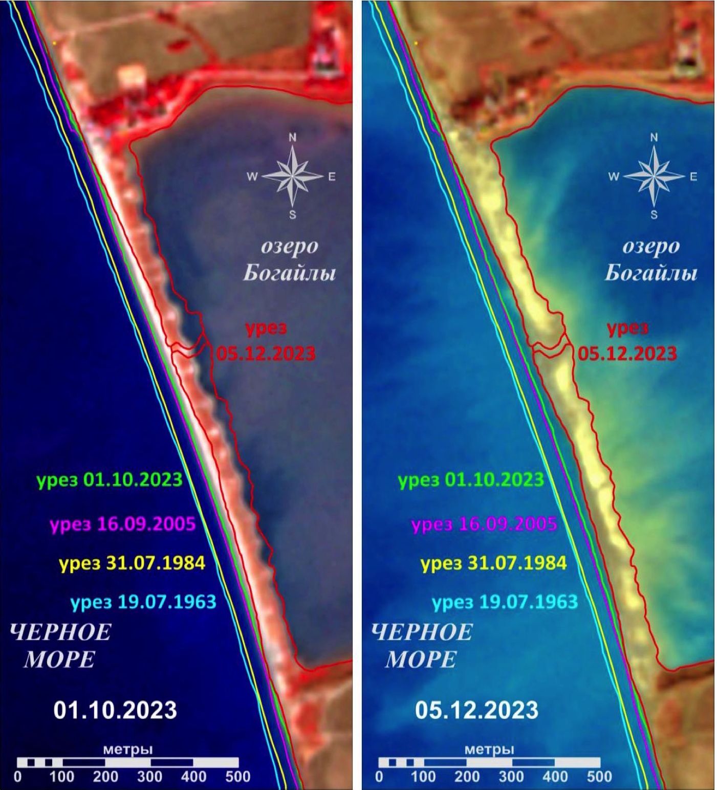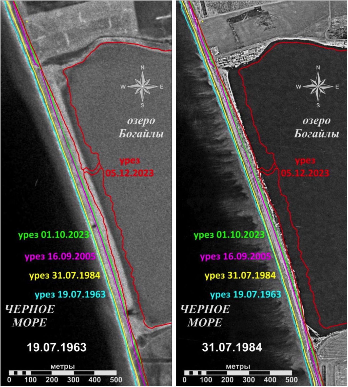 A similar process was observed both before and during the storm of 26–27 November 2023 on a number of accumulation forms in the Black Sea, in particular on the Solyonoye Lake Barrier Beach and in the southern part of the Anapa Barrier Beach. As noted above, a similar large-scale transformation of the relief of the Lake Bogaily Barrier Beach may have occurred in the late 1960s and early 1970s.