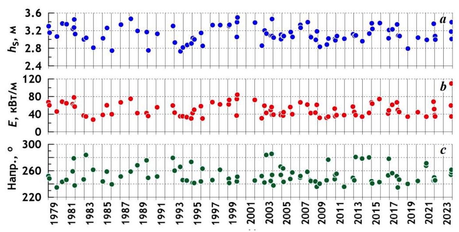 The climatic characteristics of wind waves in the Black Sea were calculated using the modern spectral wave model MIKE 21 SW [19] 5). A full description of the model, as well as the issues of model verification and tuning are described in [19]. Based on the results of calculations, an array of spatial fields of surface wave parameters was formed with a discreteness of 1 h covering the entire sea area for the period from January 1979 to December 2023.