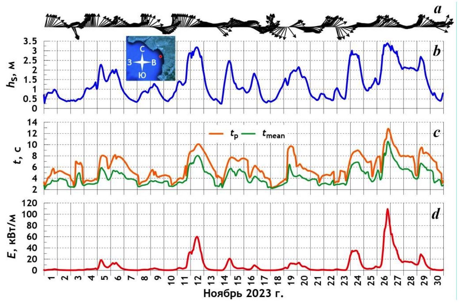 In November 2023, the Black Sea was under the influence of a series of deep Mediterranean cyclones. Winds of up to 40 m/s were observed over most of the water area. A storm wave was formed on 26–27 November 2023, exhibiting numerous parameters that surpassed those observed in the region earlier that same year. This allows us to categorise the event as an extreme natural phenomenon [14].