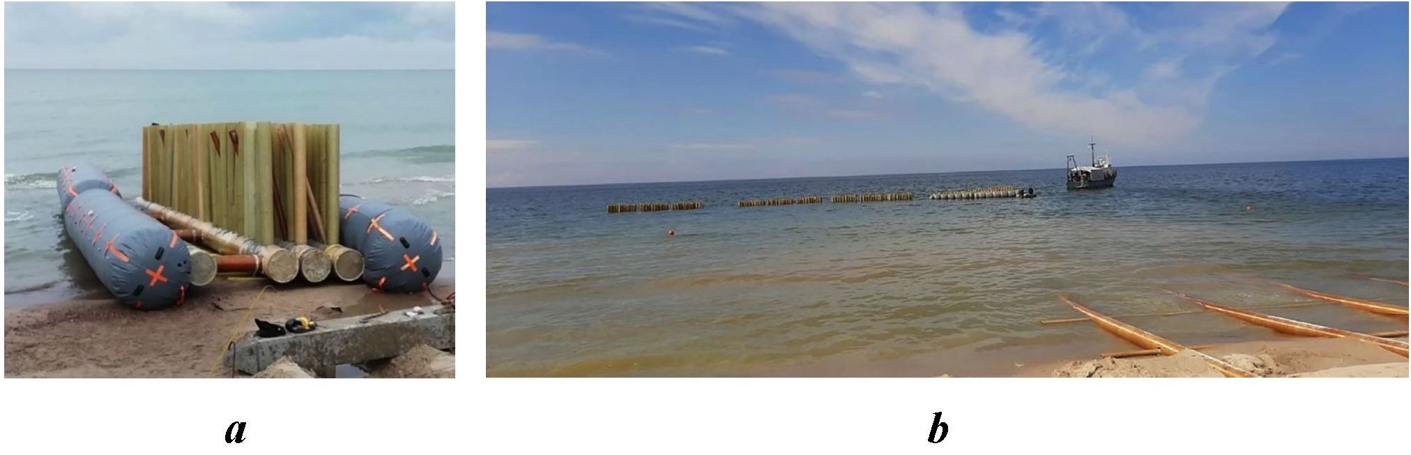 A modular breakwater design 3) was selected with a maximum length per module of 12 m (based on the ability to transport materials to the installation site) and a width of 3 m. The breakwater module (Fig. 2) consisted of a grid base (three horizontal rows of parallel 12 m long, 0.5 m diameter base pipes and an additional pipe at 0.5 m distance, connected by 3 m long, 0.25 m diameter cross pipes) served as a bottom-mounted base. All base pipes were filled with concrete. Vertically installed pipe-piles with diameters of 0.2 and 0.1 m were inserted into the main pipes of the grid base and formed a comb (grebenka) of three rows – the analogue of a pile row. The vertical pipes were 3 m high in three modules and 2.5 m high in two modules (4 and 5). An additional horizontal pipe (located seaward) at the base was without piles and functioned as a ballast pipe (visible in Fig. 2, a) to increase the module resistance to shear and overturning. The weight of the module after filling the horizontal base pipes with concrete was about 28 t. The modules were installed in a line parallel to the shore.