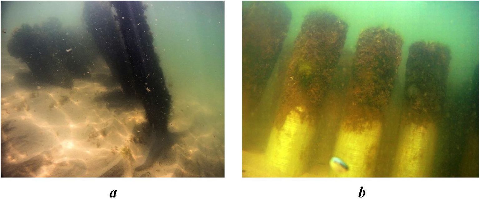 Fig. 4. State of the “Grebenka” breakwater modules: a – algae fouling and tilt of the structure (survey on 7 September 2022); b – post-storm partial exposure of the wave-damping piles from under sand (survey on April 12, 2023)