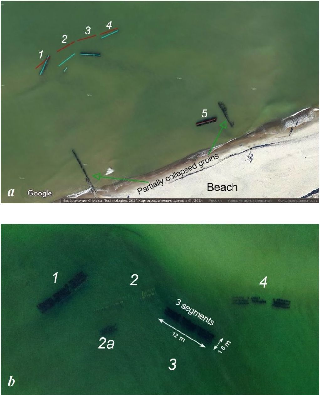 The repeated photography of all modules was carried out from the UAV on 12 April 2023 (Fig. 3, b). It uncovered module 2, which was not visible in the UAV photography dated 07 September 2022 because it was under the sand layer of the underwater berm. The tops of the vertical piles rose 0.4–1.0 m above the bottom and tilted towards the sea. Module 2 appeared to be split into two parts. Probably, the splitting of the module into several parts occurred due to the violation of installation technology of the structure. The reason for this will be definitively determined when the module is dismantled. The most probable explanation is that the connecting cross pipes of the module grid base, which were not cast in concrete, fell onto an uneven part of the bottom under the layer of sand causing the module to break when the sand was eroded.