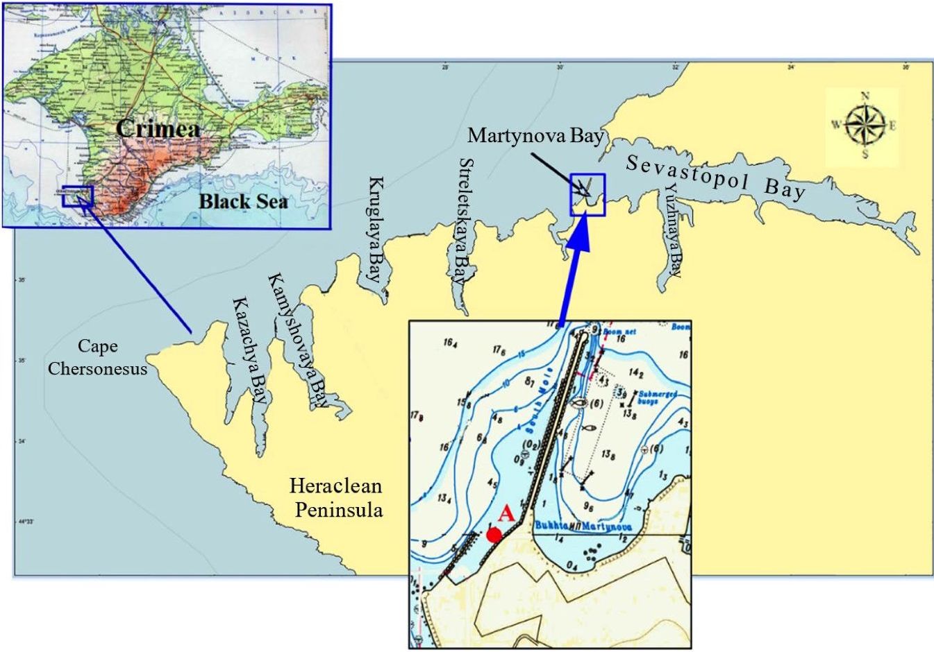 Fig. 1. Geographical position of Martynova Bay (A is the point of water temperature observations)