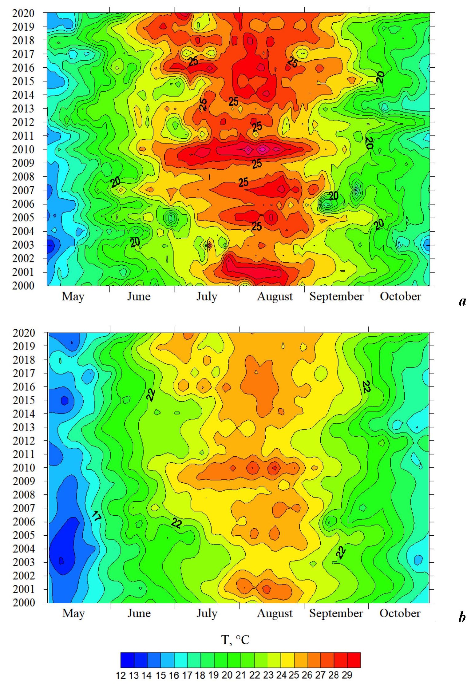 Fig. 3. Time variations of water temperature in Martynova Bay during the warm half of the year for 2000–2020: daily (a), average ten-day (b)