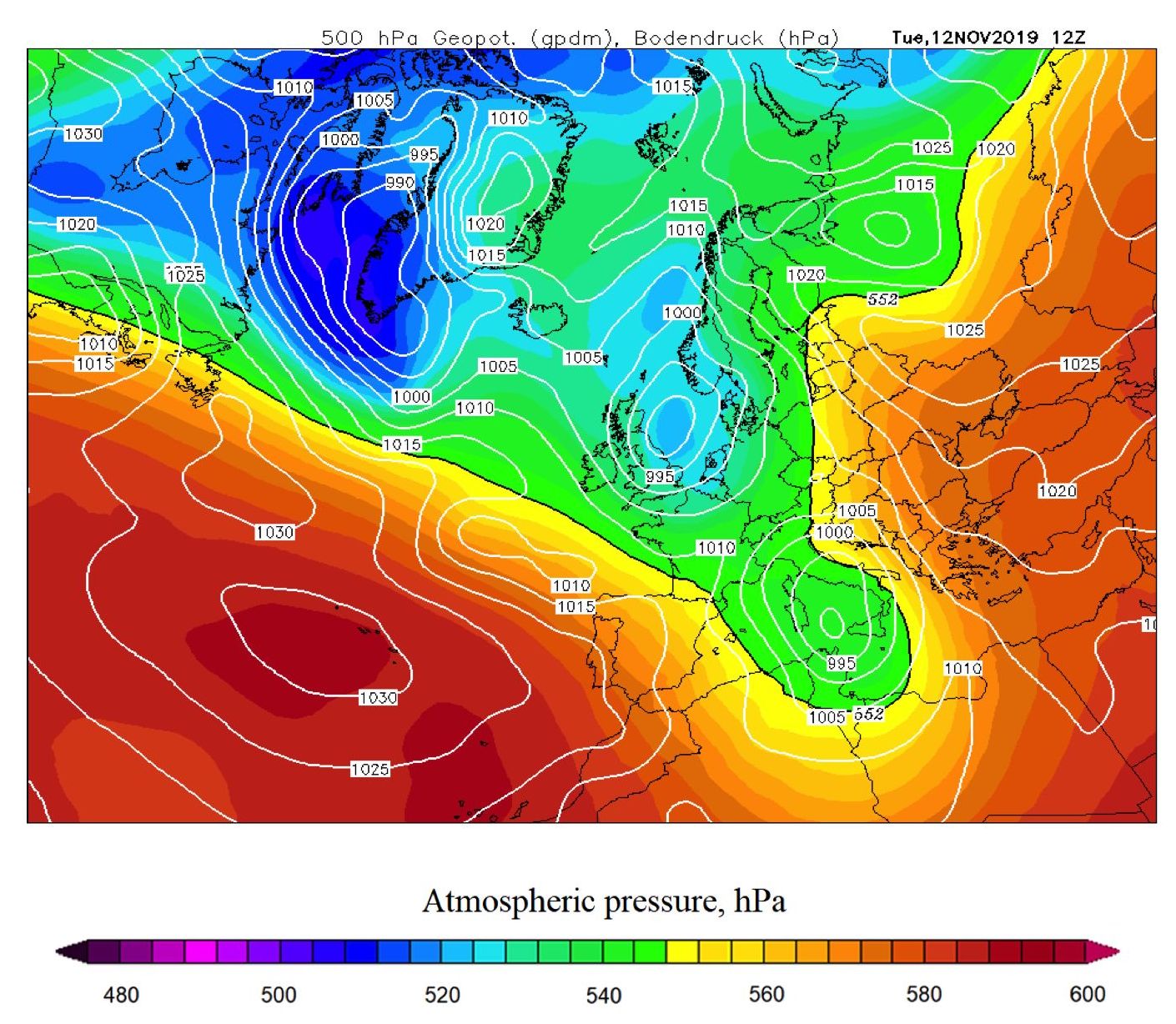 Fig. 5. Synoptic situation during the polar invasion of the Black Sea, map on 12 February 2004, 12:00 GMT