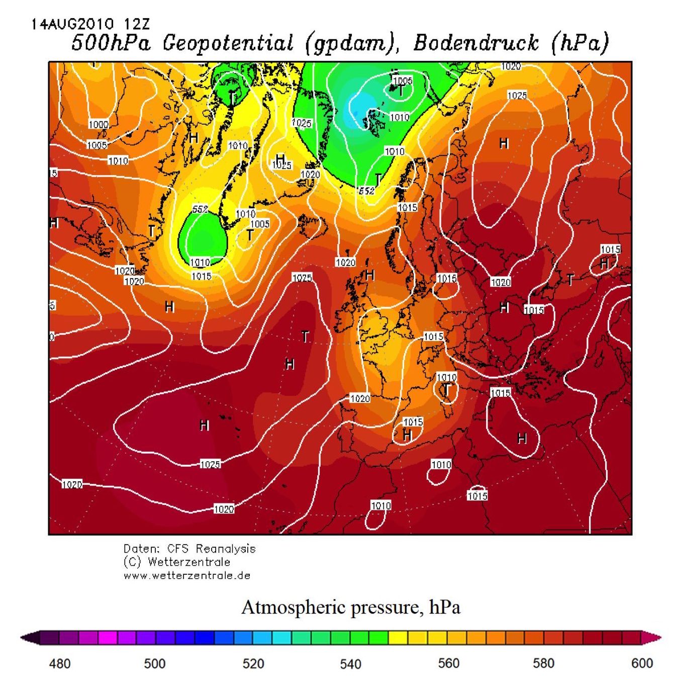 Fig. 6. Synoptic situation in conditions of superheated air outflow to the Black Sea from the Sal steppes, map on 14 August 2010, 12:00 GMT