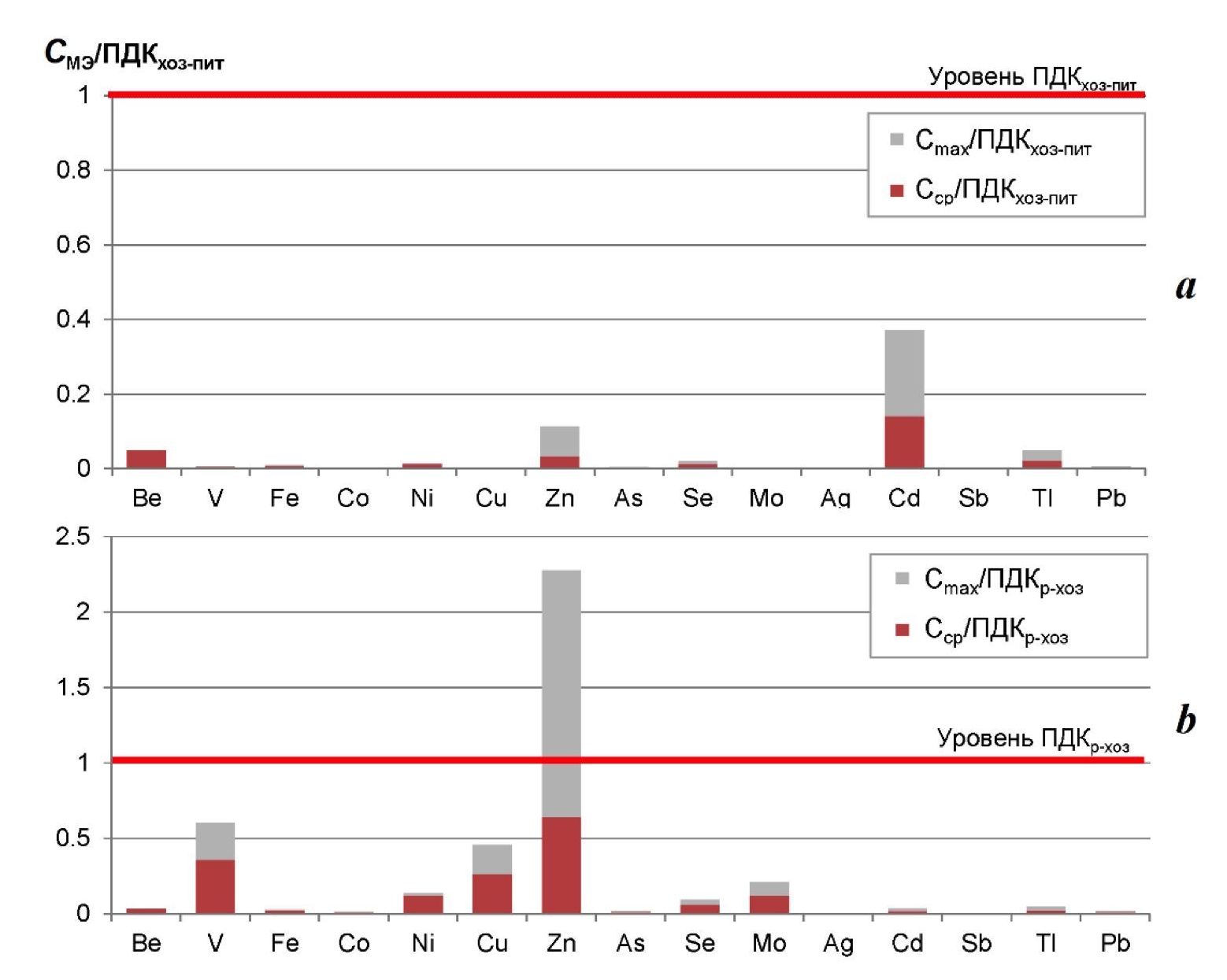 3. Fig. 2. Ratio of average and maximum concentrations of dissolved forms of trace elements in the North Crimean Canal water to maximum permissible concentrations (MPC) for utility and drinking water use ПДКхоз-пит (a) and MPC for fisheries ПДКр-хоз (b) in 2022–2023