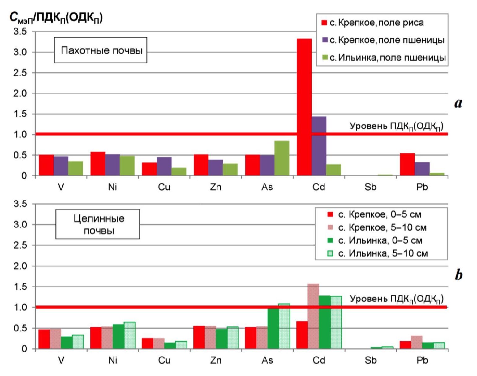 4. Fig. 3. Ratio of trace elements concentrations (Смэ) in soils of arable (a) and virgin (b) land plots in the north of Crimea to the maximum (ПДКп) and approximately (ОДКп) permissible concentrations of elements in soils in 2022–2023