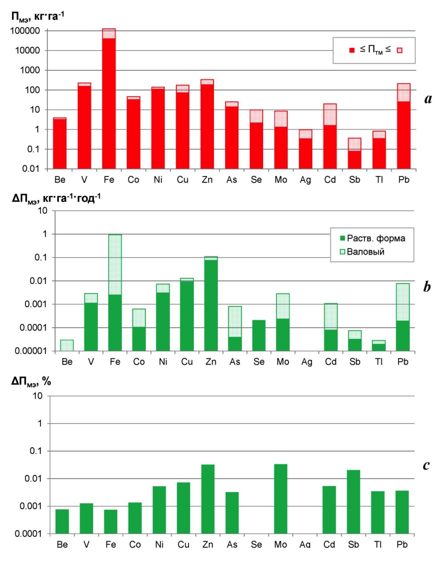 5. Fig. 4. Ranges of specific pools of trace elements (a) in arable soils of Crimea (Пмэ) and assessment of the absolute (b) and relative (c) changes in these pools (ΔПмэ) due to the supply with the North Crimean Canal waters used for irrigation