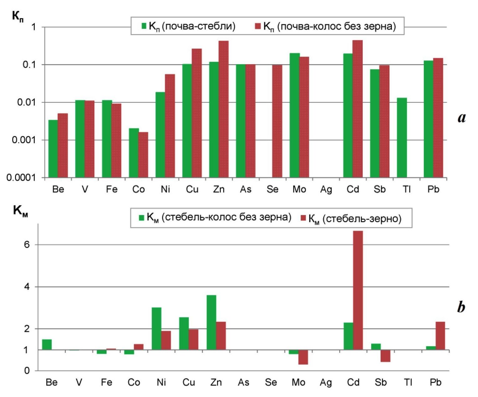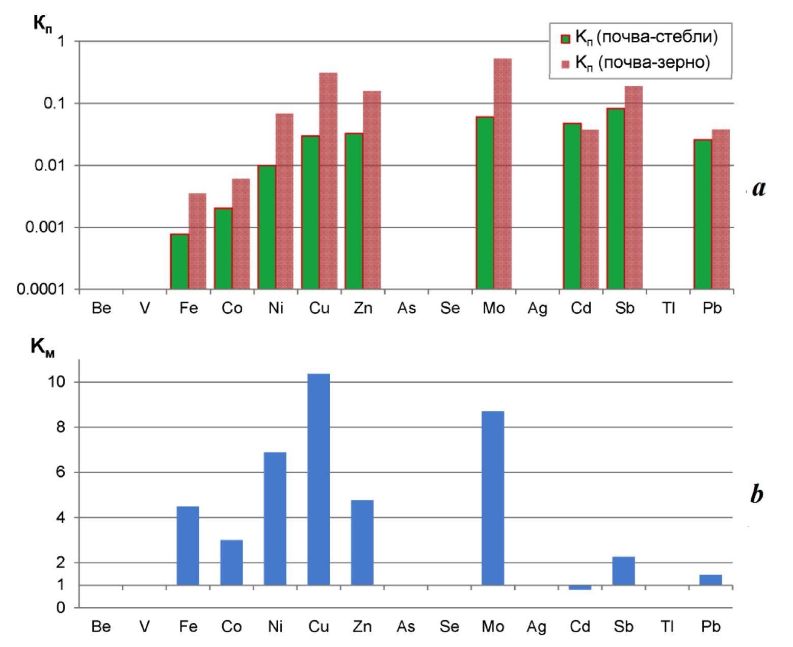 Fig. 5. Coefficients Кп (conversion factor) (a) and Км (magnification coefficient) (b) of the trace elements for rice crops in the village of Krepkoe