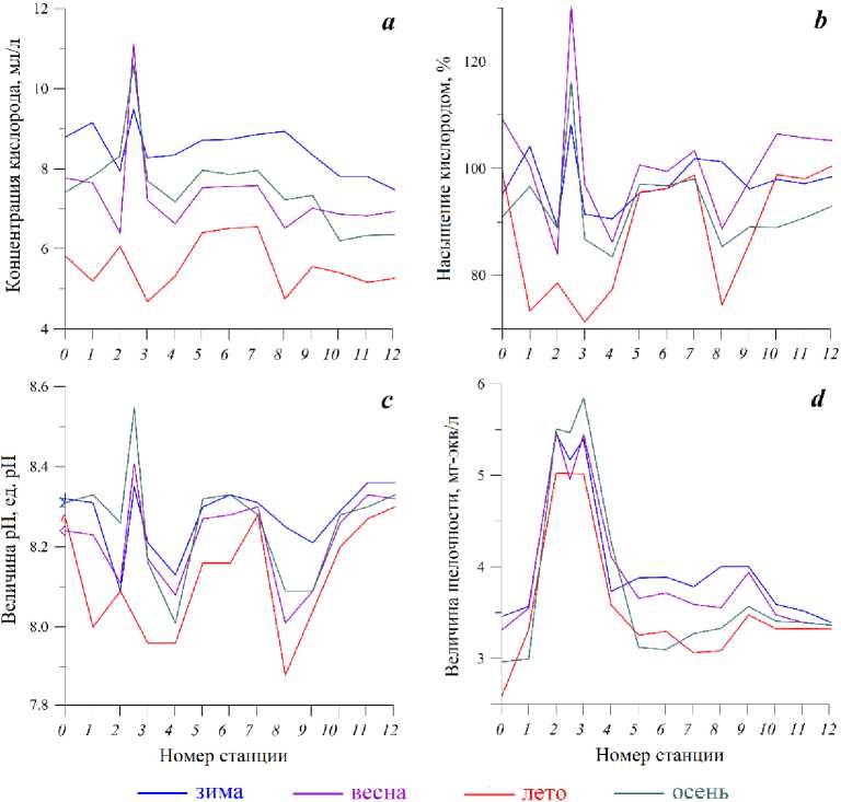Fig. 2. Oxygen content (a), water oxygen saturation (b), pH value (c) and total alkalinity value (d) at the stations of the lower Chernaya River in 2012–2023