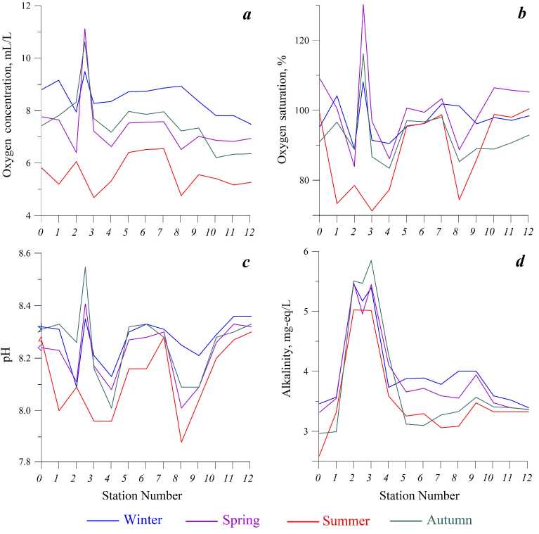 The tributaries of the Baydarka and Urkusta Rivers exert the most significant influence on the alkalinity value of the river water, with a pH level exceeding 5 mg-eq/L. This results in an increase in the alkalinity of the Chernaya River water following the discharge of the tributaries (Fig. 2, d). Seasonal variations of alkalinity demonstrate a distinct pattern, with the highest values observed in winter, subsequent decline in spring and further reduction in summer. Conversely, autumn marks a period of increased alkalinity. Nevertheless, these fluctuations have a negligible impact on the alkalinity of the IB waters, with the average alkalinity of the bay surface waters remaining largely unaltered at ~3.4 mg-eq/L.