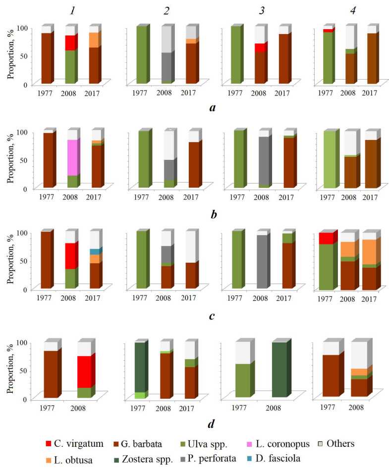 Fig. 2. Change in the proportion of dominant macrophyte species by рrofile and years at the depth of 0.5 m (a), 1 m (b), 3 m (c) and 5 m (d) (1 – Cape Konstantinovsky; 2 – Cape Khrustalny; 3 – Cape Slavy; 4 – Monument to the Sunken Ships)