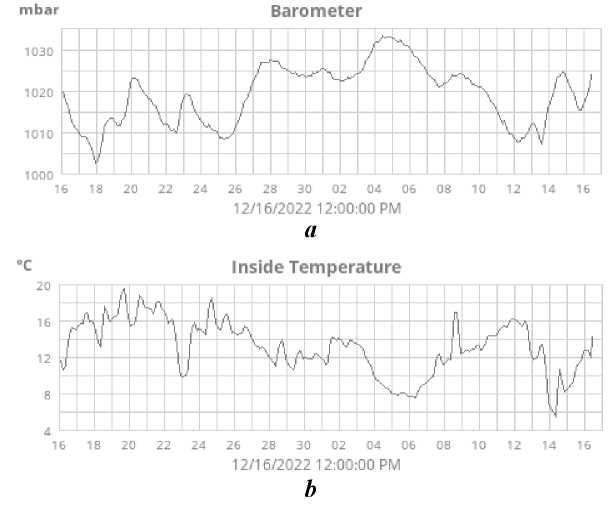 Fig. 2. Example of view of data on pressure (a) and inside temperature (b) on the platform in Katsiveli from 16 November 2022 to 16 December 2022