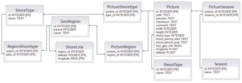 Fig. 1. The scheme of the database for the software system PhotoCoasts of Crimea