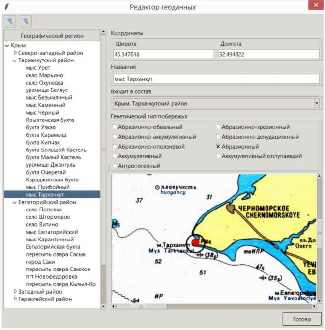 При заполнении метаданных изображения в разрабатываемой программной системе была реализована возможность чтения данных из заголовков Exif загружаемых файлов (в том числе координат места съемки по данным GPS и даты съемки) и внедрена функциональность, позволяющая по координатам места съемки определить регион и генетический тип побережья. В качестве региона съемки выбирается ближайший из известных приложению. В частности, в базе ИПС «ФотоБерега Крыма» присутствует информация о 140 регионах побережья из монографии [7]. Для поиска региона, ближайшего к точке съемки, в программе применяется индексация геоданных береговой линии на равномерной сетке в полярной системе координат [10] с центром в точке 45.5° с. ш., 34.0° в. д.