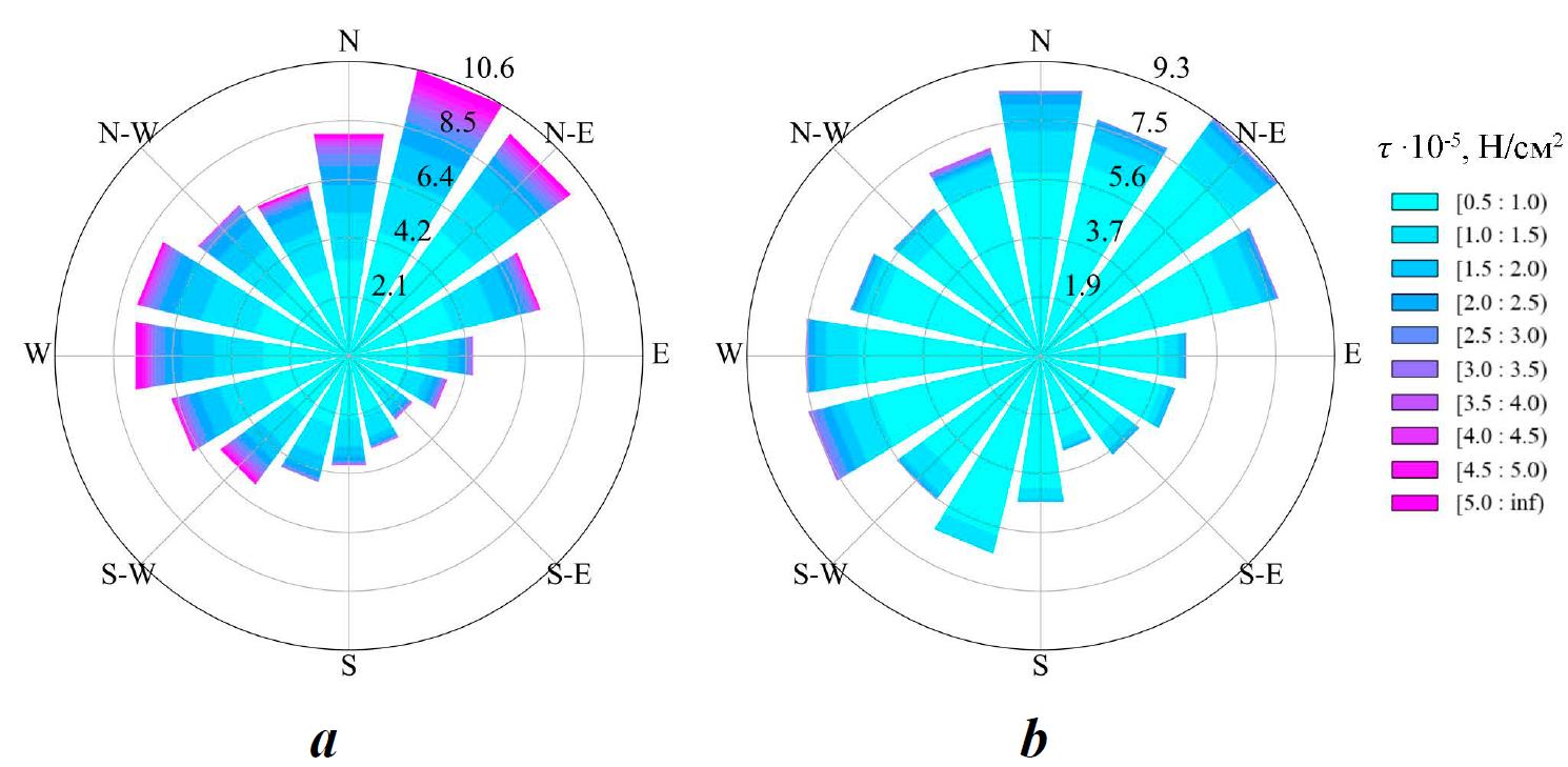 Fig. 1. Histograms of repeatability, %, of the wind directions and the wind stress values τ for the Black Sea in 2016: a – ERA5; b – SKIRON. The data are calculated from wind speed at a height of 10 m