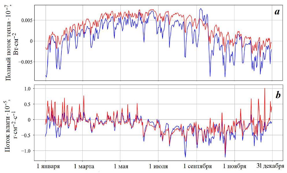 Fig. 3. Total fluxes of heat (a) and moisture (b) in 2016 according to ERA5 (red lines) and SKIRON (blue lines)