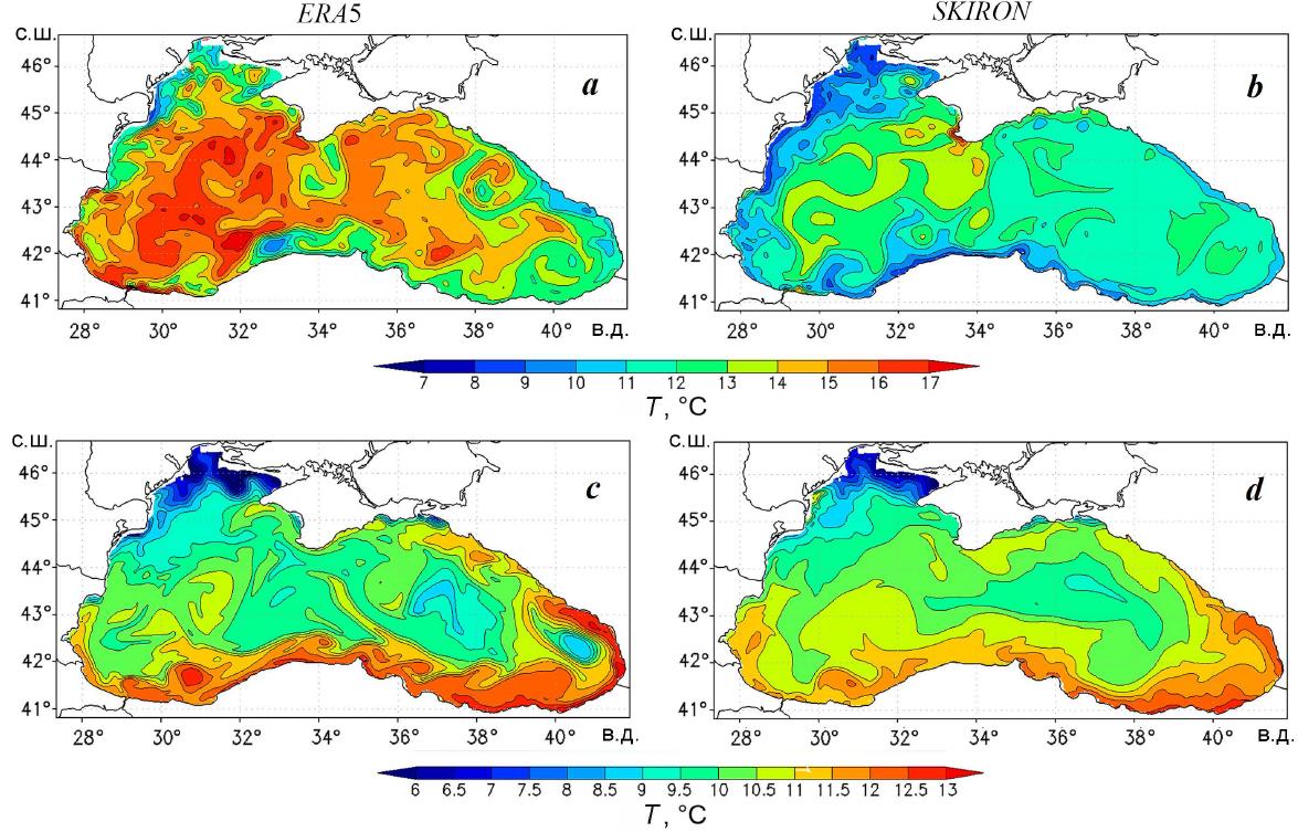 Fig. 5 shows temperature distributions at the 20 m horizon on 15 June and 15 December calculated in two experiments. It can be seen that in June, the difference between temperature values from ERA5 and SKIRON data for the western part of the basin averaged 3–4 °C, for the eastern part – up to 3 °C (Fig. 5, а, b).